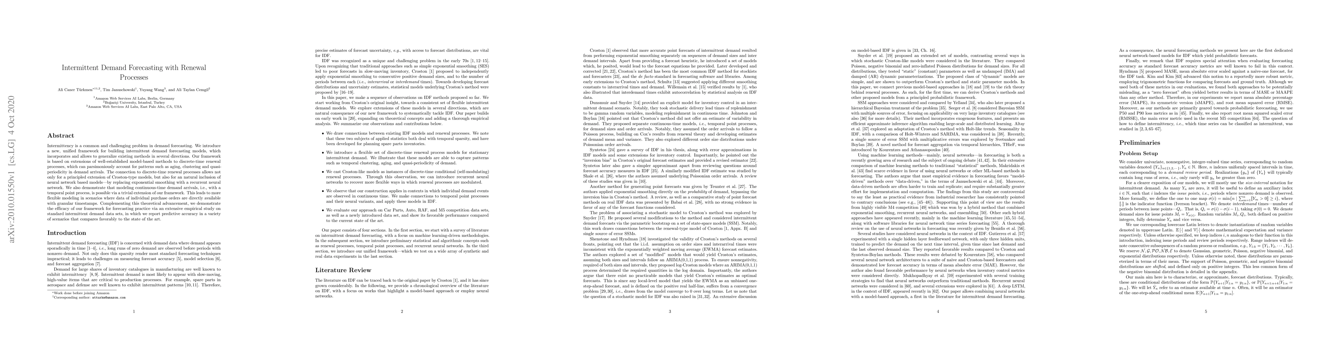Intermittency is a common and challenging problem in demand forecasting. We introduce a new, unified framework for building intermittent demand forecasting models, which incorporates and allows to generalize existing methods in several directions. Our framework is based on extensions of well-established model-based methods to discrete-time renewal processes, which can parsimoniously account for patterns such as aging, clustering and quasi-periodicity in demand arrivals. The connection to discrete-time renewal processes allows not only for a principled extension of Croston-type models, but also for an natural inclusion of neural network based models---by replacing exponential smoothing with a recurrent neural network. We also demonstrate that modeling continuous-time demand arrivals, i.e., with a temporal point process, is possible via a trivial extension of our framework. This leads to more flexible modeling in scenarios where data of individual purchase orders are directly available with granular timestamps. Complementing this theoretical advancement, we demonstrate the efficacy of our framework for forecasting practice via an extensive empirical study on standard intermittent demand data sets, in which we report predictive accuracy in a variety of scenarios that compares favorably to the state of the art.