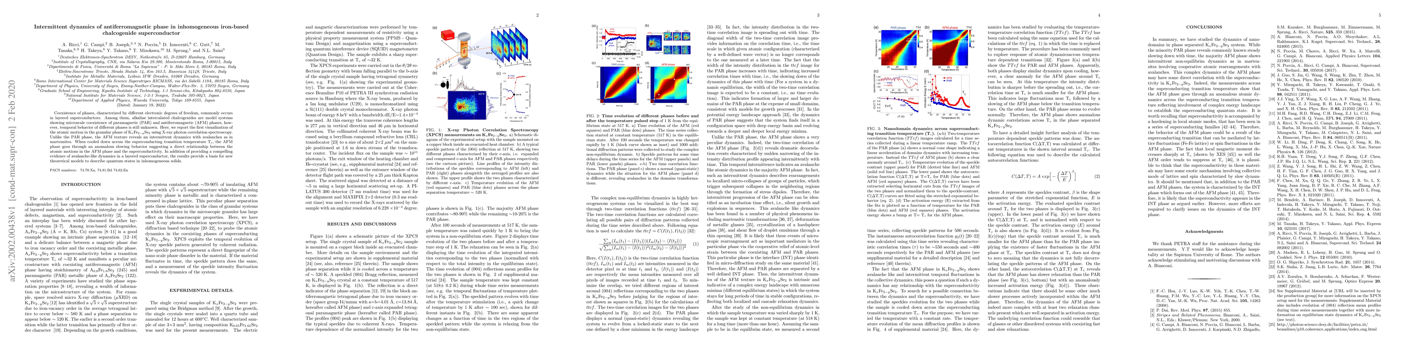 Coexistence of phases, characterized by different electronic degrees of freedom, commonly occurs in layered superconductors. Among them, alkaline intercalated chalcogenides are model systems showing microscale coexistence of paramagnetic (PAR) and antiferromagnetic (AFM) phases, however, temporal behavior of different phases is still unknown. Here, we report the first visualization of the atomic motion in the granular phase of K$_{x}$Fe$_{2-y}$Se$_2$ using X-ray photon correlation spectroscopy. Unlike the PAR phase, the AFM texture reveals an intermittent dynamics with avalanches as in martensites. When cooled down across the superconducting transition temperature T$_c$, the AFM phase goes through an anomalous slowing behavior suggesting a direct relationship between the atomic motions in the AFM phase and the superconductivity. In addition of providing a compelling evidence of avalanche-like dynamics in a layered superconductor, the results provide a basis for new theoretical models to describe quantum states in inhomogeneous solids.