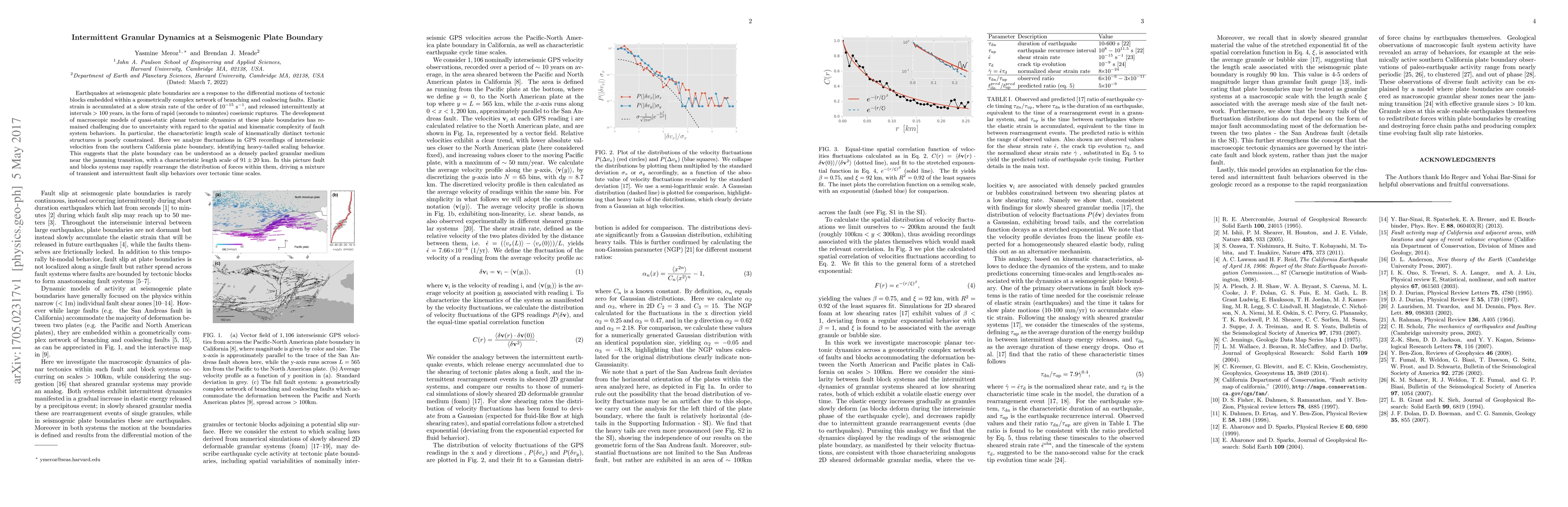 This paper investigates the intermittent granular dynamics at the southern California seismogenic plate boundary, revealing heavy-tailed scaling behavior in GPS recordings. The study suggests the boundary behaves like a granular medium near the jamming transition, with a characteristic length scale of 91 ± 20 km, indicating complex fault system interactions.