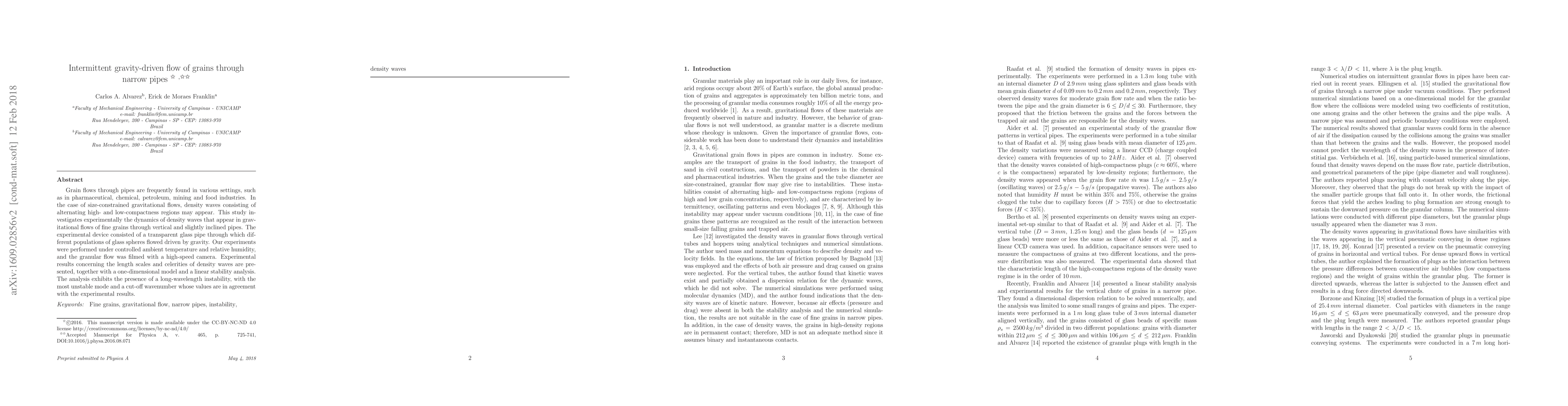 This study experimentally investigates the dynamics of density waves in intermittent gravity-driven grain flows through vertical and slightly inclined pipes, revealing long-wavelength instabilities and validating the findings with a one-dimensional model and linear stability analysis.