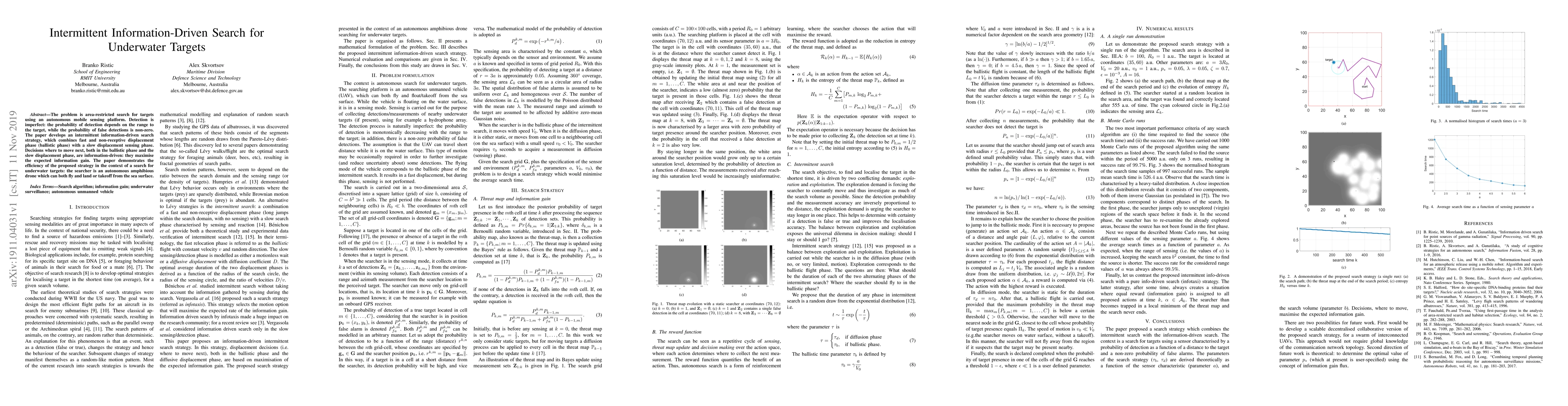 The problem is area-restricted search for targets using an autonomous mobile sensing platform. Detection is imperfect: the probability of detection depends on the range to the target, while the probability of false detections is non-zero. The paper develops an intermittent information-driven search strategy, which combines fast and non-receptive displacement phase (ballistic phase) with a slow displacement sensing phase. Decisions where to move next, both in the ballistic phase and the slow displacement phase, are information-driven: they maximise the expected information gain. The paper demonstrates the efficiency of the proposed strategy in the context of a search for underwater targets: the searcher is an autonomous amphibious drone which can both fly and land or takeoff from the sea surface.