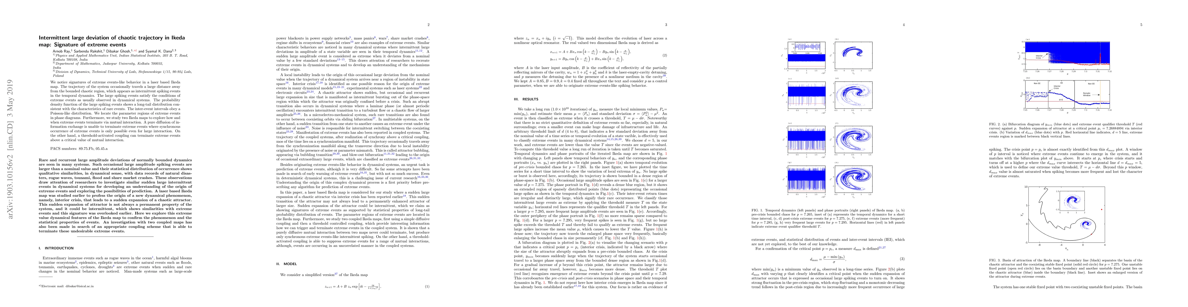This paper investigates the intermittent large deviation behavior in the Ikeda map, identifying extreme events characterized by rare, large spiking events. These events exhibit long-tail distribution and Poisson-like inter-event intervals, and their termination is influenced by the type of interaction between two maps, with threshold-activated coupling proving effective.