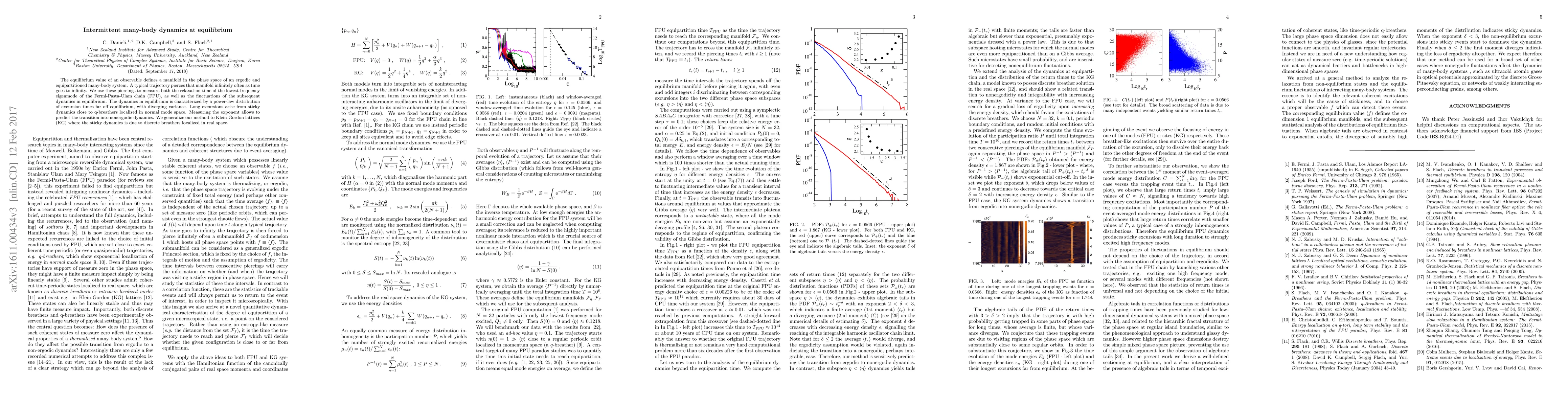 The equilibrium value of an observable defines a manifold in the phase space of an ergodic and equipartitioned many-body system. A typical trajectory pierces that manifold infinitely often as time goes to infinity. We use these piercings to measure both the relaxation time of the lowest frequency eigenmode of the Fermi-Pasta-Ulam chain (FPU), as well as the fluctuations of the subsequent dynamics in equilibrium. The dynamics in equilibrium is characterized by a power-law distribution of excursion times far off equilibrium, with diverging variance. Long excursions arise from sticky dynamics close to q-breathers localized in normal mode space. Measuring the exponent allows to predict the transition into nonergodic dynamics. We generalize our method to Klein-Gordon lattices (KG) where the sticky dynamics is due to discrete breathers localized in real space.