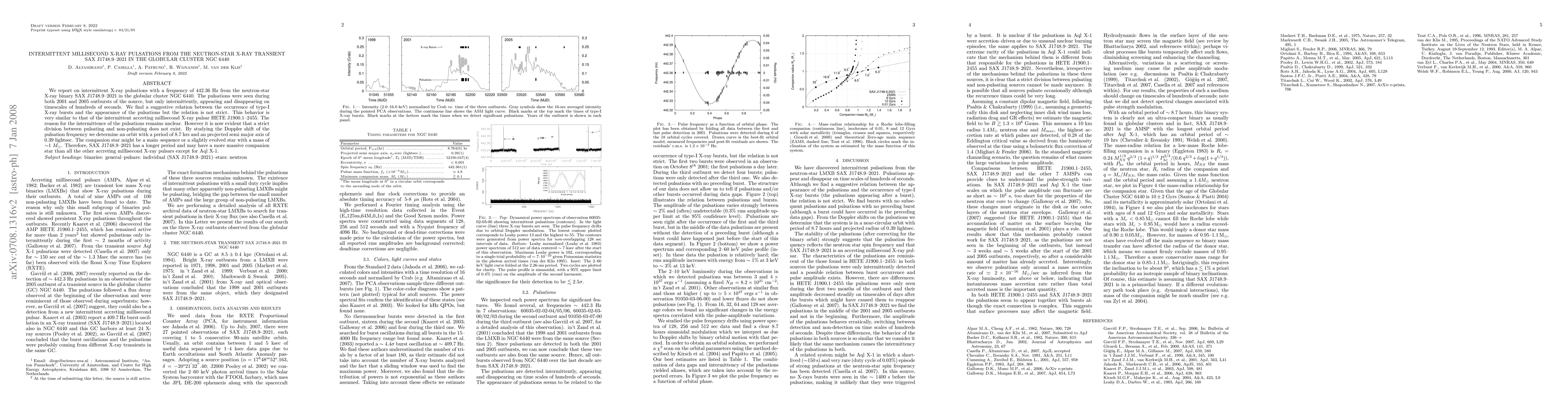 This paper reports intermittent X-ray pulsations at 442.36 Hz from the neutron-star binary SAX J1748.9-2021, showing similarities to another intermittent pulsar HETE J1900.1-2455. The study reveals an orbital period of 8.7 hours and suggests the companion star may be a main-sequence or slightly evolved star with a mass of about 1 solar mass.