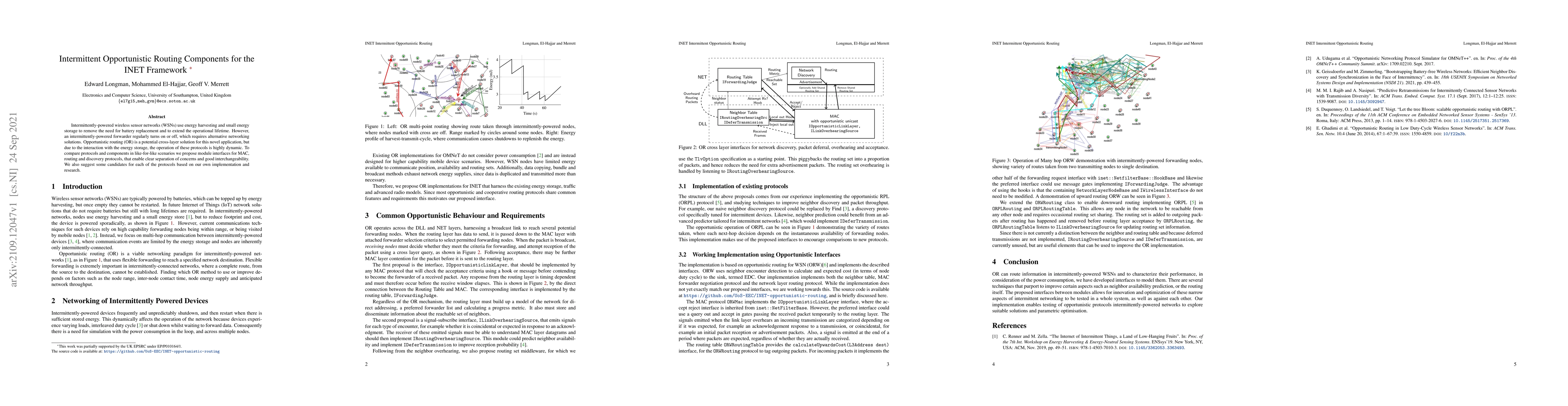 This paper proposes module interfaces for MAC, routing, and discovery protocols within the INET framework to address the challenges of intermittently-powered wireless sensor networks. It aims to enable clear separation of concerns and interchangeability, suggesting candidates for each protocol based on the authors' implementation and research.