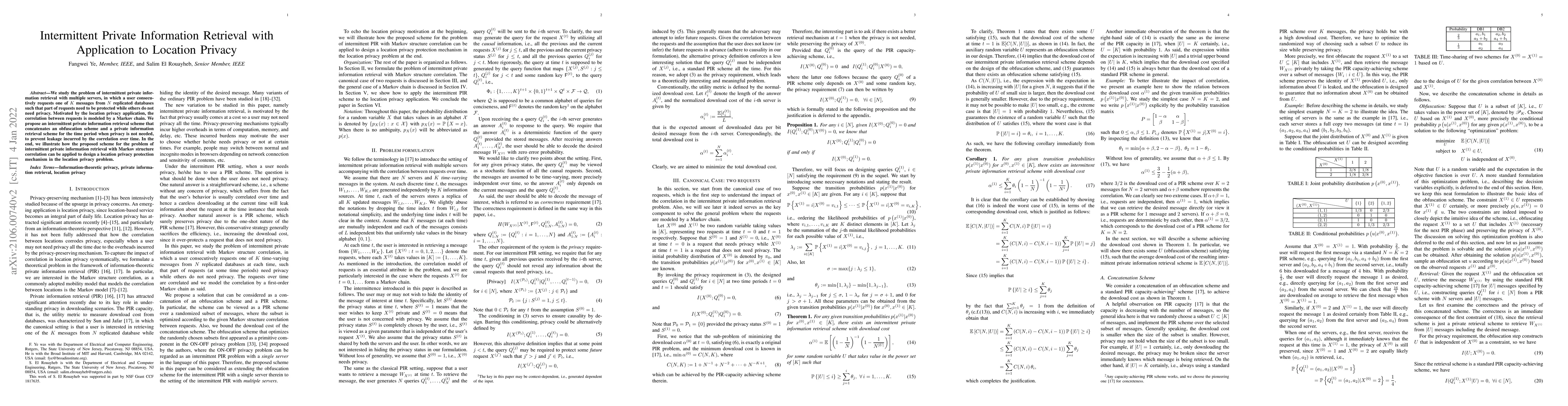 This paper proposes an intermittent private information retrieval scheme for users requesting messages from multiple servers, where some requests require privacy protection. The scheme combines obfuscation and private information retrieval to manage privacy needs over time, modeled by a Markov chain, and demonstrates its application in enhancing location privacy.