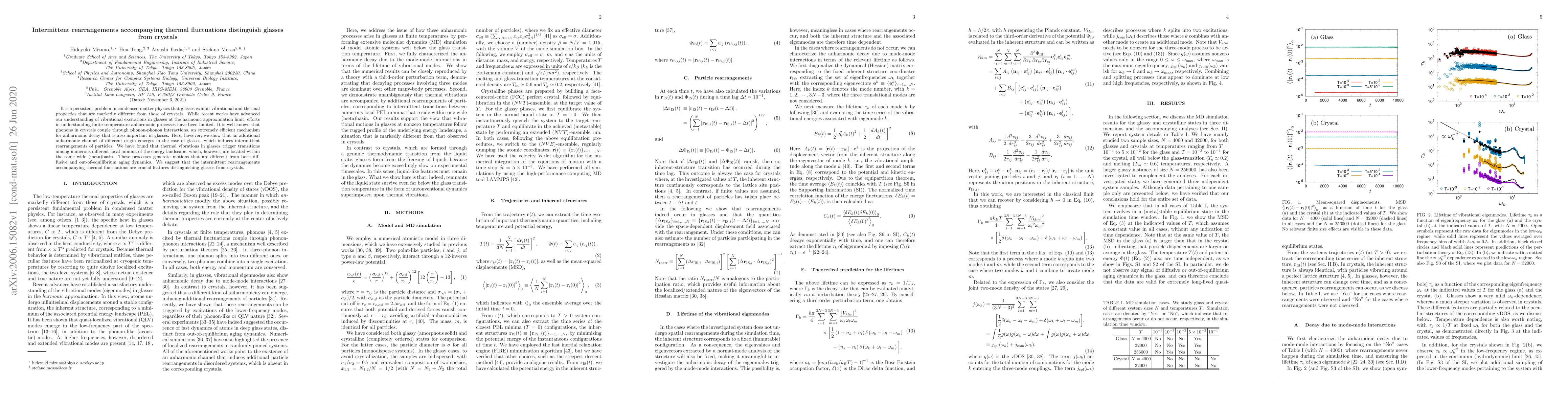 It is a persistent problem in condensed matter physics that glasses exhibit vibrational and thermal properties that are markedly different from those of crystals. While recent works have advanced our understanding of vibrational excitations in glasses at the harmonic approximation limit, efforts in understanding finite-temperature anharmonic processes have been limited. It is well known that phonons in crystals couple through phonon-phonon interactions, an extremely efficient mechanism for anharmonic decay that is also important in glasses. Here, however, we show that an additional anharmonic channel of different origin emerges in the case of glasses, which induces intermittent rearrangements of particles. We have found that thermal vibrations in glasses trigger transitions among numerous different local minima of the energy landscape, which, however, are located within the same wide (meta)basin. These processes generate motions that are different from both diffusive and out-of-equilibrium aging dynamics. We suggest that the intermittent rearrangements accompanying thermal fluctuations are crucial features distinguishing glasses from crystals.