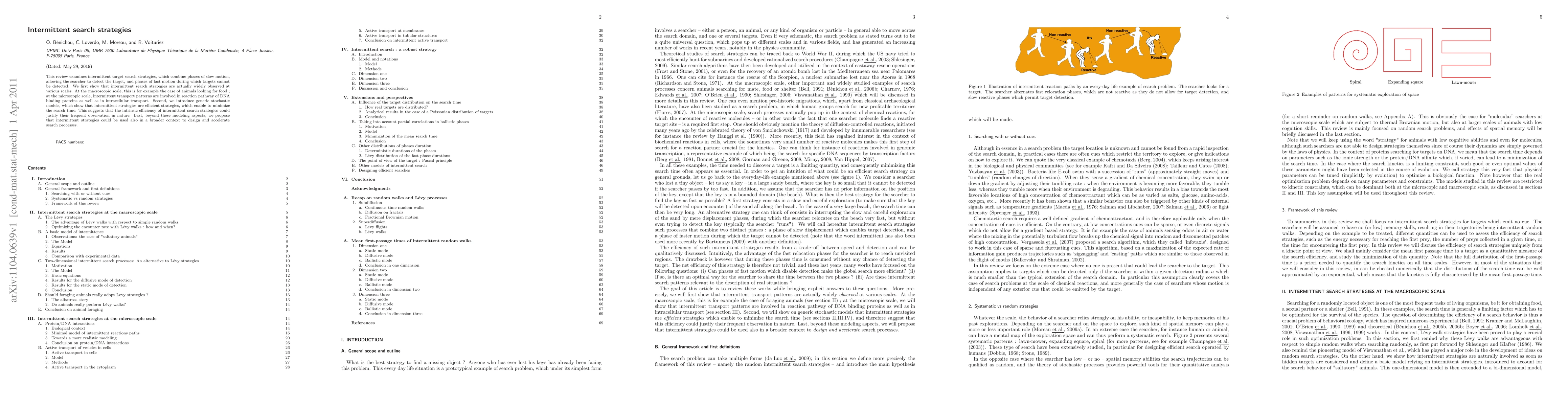 This review examines intermittent target search strategies, which combine phases of slow motion, allowing the searcher to detect the target, and phases of fast motion during which targets cannot be detected. We first show that intermittent search strategies are actually widely observed at various scales. At the macroscopic scale, this is for example the case of animals looking for food ; at the microscopic scale, intermittent transport patterns are involved in reaction pathway of DNA binding proteins as well as in intracellular transport. Second, we introduce generic stochastic models, which show that intermittent strategies are efficient strategies, which enable to minimize the search time. This suggests that the intrinsic efficiency of intermittent search strategies could justify their frequent observation in nature. Last, beyond these modeling aspects, we propose that intermittent strategies could be used also in a broader context to design and accelerate search processes.