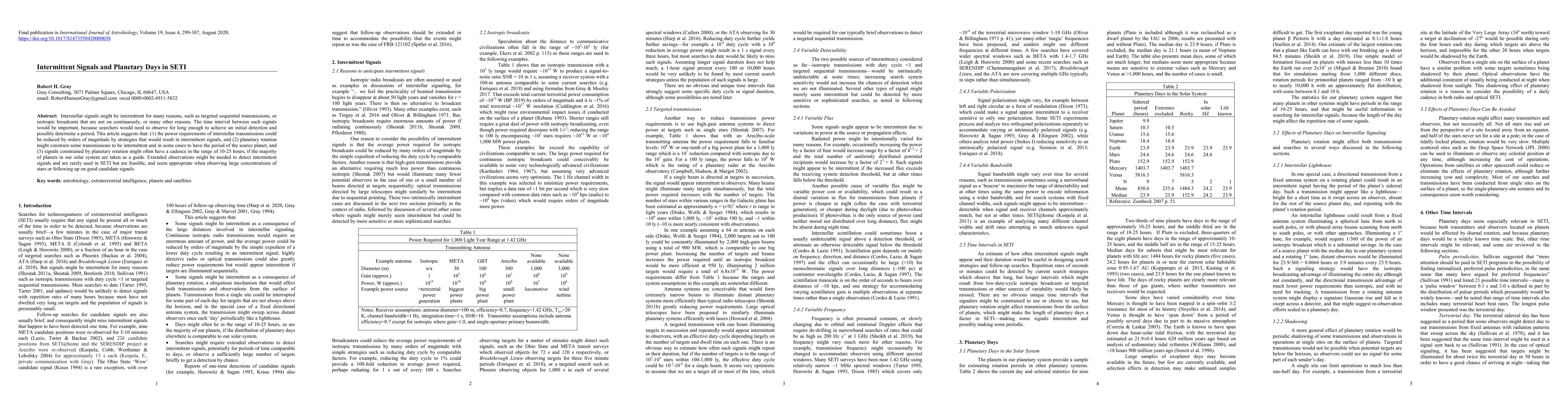 Interstellar signals might be intermittent for many reasons, such as targeted sequential transmissions, or isotropic broadcasts that are not on continuously, or many other reasons. The time interval between such signals would be important, because searchers would need to observe for long enough to achieve an initial detection and possibly determine a period. This article suggests that: (1) the power requirements of interstellar transmissions could be reduced by orders of magnitude by strategies that would result in intermittent signals, and (2) planetary rotation might constrain some transmissions to be intermittent and in some cases to have the period of the source planet, and (3) signals constrained by planetary rotation might often have a cadence in the range of 10-25 hours, if the majority of planets in our solar system are taken as a guide. Extended observations might be needed to detect intermittent signals and are rarely used in SETI but are feasible, and seem appropriate when observing large concentrations of stars or following up on good candidate signals.