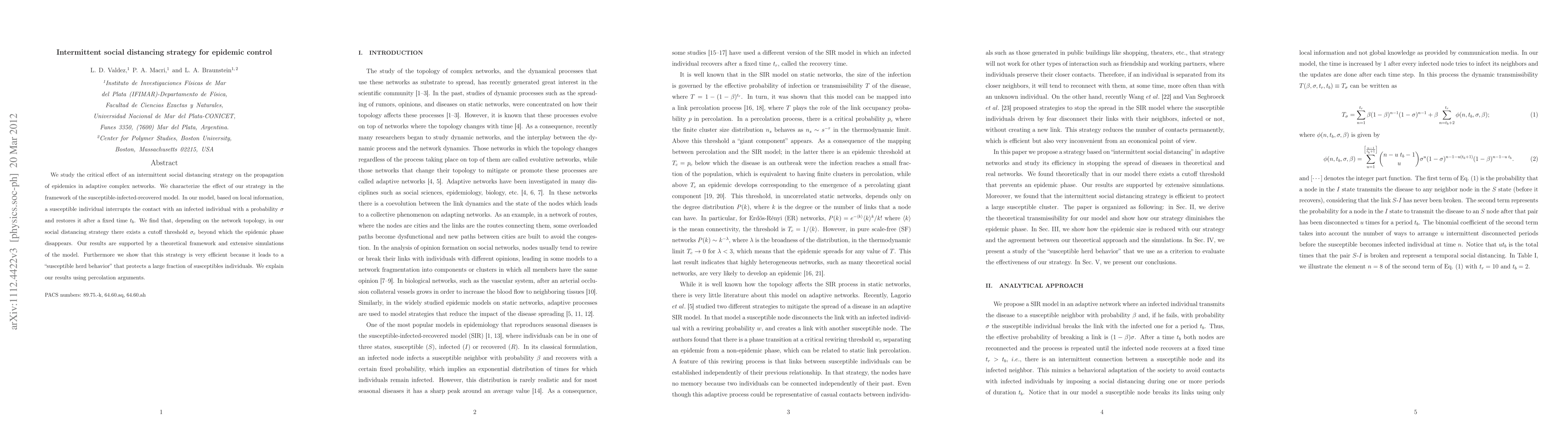 This paper investigates the impact of intermittent social distancing on epidemic control in adaptive networks, finding a cutoff threshold $\sigma_{c}$ beyond which the epidemic phase vanishes. The strategy effectively protects a large fraction of susceptible individuals, supported by theoretical analysis and simulations.