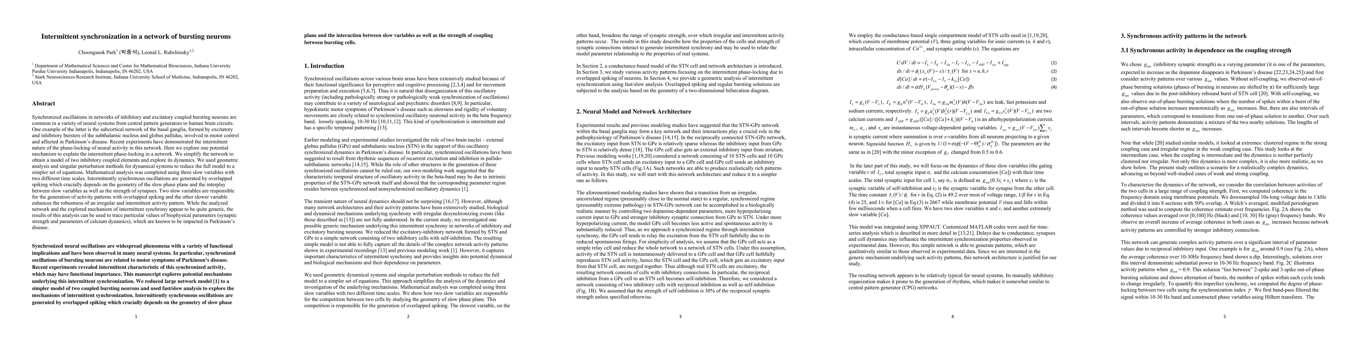 Synchronized oscillations in networks of inhibitory and excitatory coupled bursting neurons are common in a variety of neural systems from central pattern generators to human brain circuits. One example of the latter is the subcortical network of the basal ganglia, formed by excitatory and inhibitory bursters of the subthalamic nucleus and globus pallidus, involved in motor control and affected in Parkinson's disease. Recent experiments have demonstrated the intermittent nature of the phase-locking of neural activity in this network. Here we explore one potential mechanism to explain the intermittent phase-locking in a network. We simplify the network to obtain a model of two inhibitory coupled elements and explore its dynamics. We used geometric analysis and singular perturbation methods for dynamical systems to reduce the full model to a simpler set of equations. Mathematical analysis was completed using three slow variables with two different time scales. Intermittently synchronous oscillations are generated by overlapped spiking which crucially depends on the geometry of the slow phase plane and the interplay between slow variables as well as the strength of synapses. Two slow variables are responsible for the generation of activity patterns with overlapped spiking and the other slower variable enhances the robustness of an irregular and intermittent activity pattern. While the analyzed network and the explored mechanism of intermittent synchrony appear to be quite generic, the results of this analysis can be used to trace particular values of biophysical parameters (synaptic strength and parameters of calcium dynamics), which are known to be impacted in Parkinson's disease.