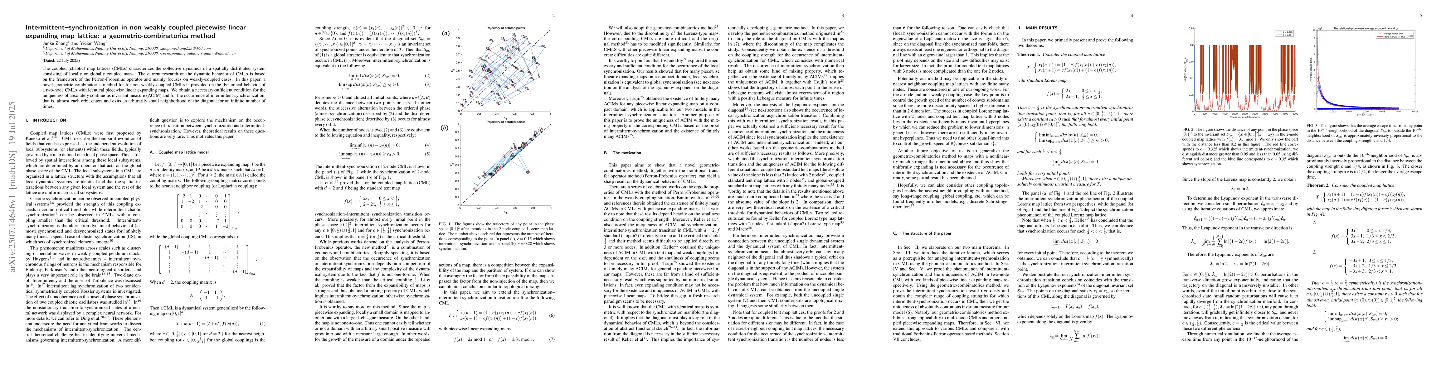 The coupled (chaotic) map lattices (CMLs) characterizes the collective dynamics of a spatially distributed system consisting of locally or globally coupled maps. The current research on the dynamic behavior of CMLs is based on the framework of the Perron-Frobenius operator and mainly focuses on weakly-coupled cases. In this paper, a novel geometric-combinatorics method for for non weakly-coupled CMLs is provided on the dynamical behavior of a two-node CMLs with identical piecewise linear expanding maps. We obtain a necessary-sufficient condition for the uniqueness of absolutely continuous invariant measure (ACIM) and for the occurrence of intermittent-synchronization, that is, almost each orbit enters and exits an arbitrarily small neighborhood of the diagonal for an infinite number of times.