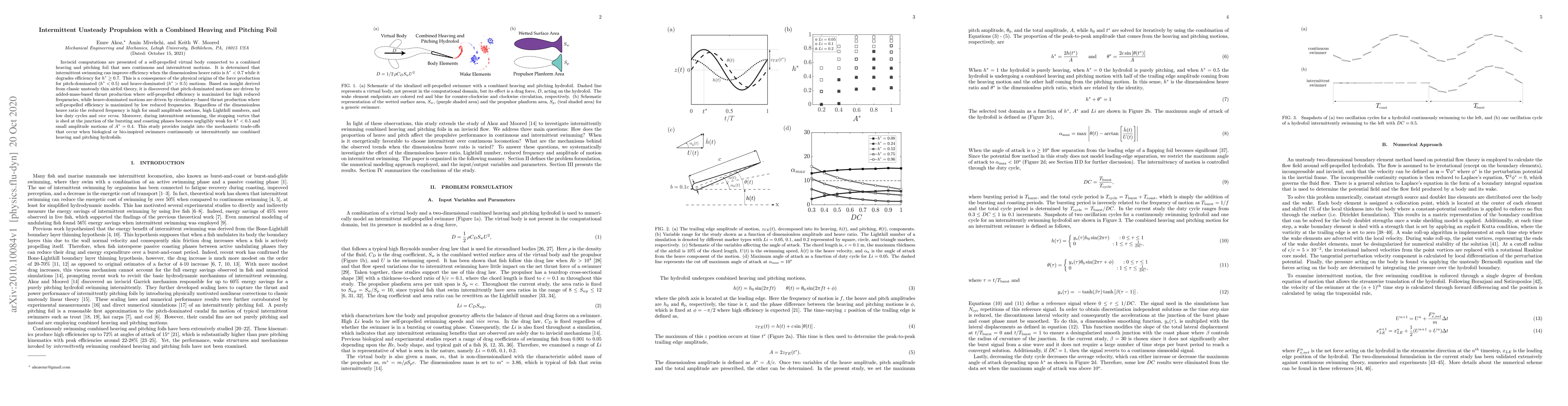 Intermittent swimming with a combined heaving and pitching foil improves efficiency at low heave ratios (< 0.7), while degrading efficiency above this threshold. The study reveals mechanistic trade-offs in self-propelled efficiency driven by pitch-dominated and heave-dominated motions.