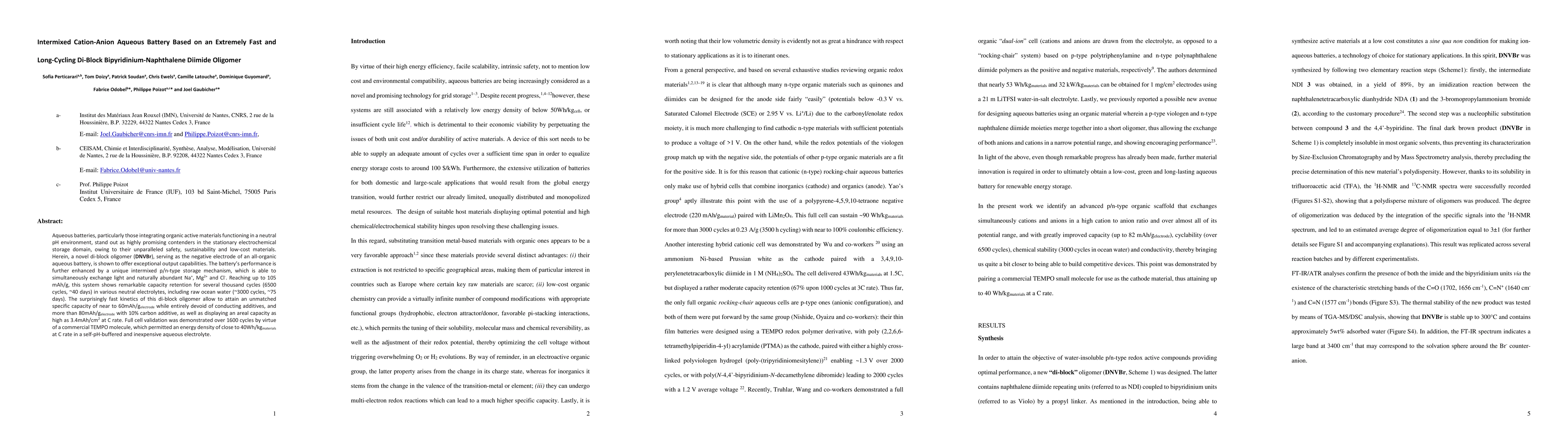 Aqueous batteries, particularly those integrating organic active materials functioning in a neutral pH environment, stand out as highly promising contenders in the stationary electrochemical storage domain, owing to their unparalleled safety, sustainability and low-cost materials. Herein, a novel di-block oligomer (DNVBr), serving as the negative electrode of an all-organic aqueous battery, is shown to offer exceptional output capabilities. The battery's performance is further enhanced by a unique intermixed p/n-type storage mechanism, which is able to simultaneously exchange light and naturally abundant Na+, Mg2+ and Cl-. Reaching up to 105 mAh/g, this system shows remarkable capacity retention for several thousand cycles (6500 cycles, ~40 days) in various neutral electrolytes, including raw ocean water (~3000 cycles, ~75 days). The surprisingly fast kinetics of this di-block oligomer allow to attain an unmatched specific capacity of near to 60mAh/g electrode while entirely devoid of conducting additives, and more than 80mAh/g electrode with 10% carbon additive, as well as displaying an areal capacity as high as 3.4mAh/cm2 at C rate. Full cell validation was demonstrated over 1600 cycles by virtue of a commercial TEMPO molecule, which permitted an energy density of close to 40Wh/kgmaterials at C rate in a self-pH-buffered and inexpensive aqueous electrolyte.