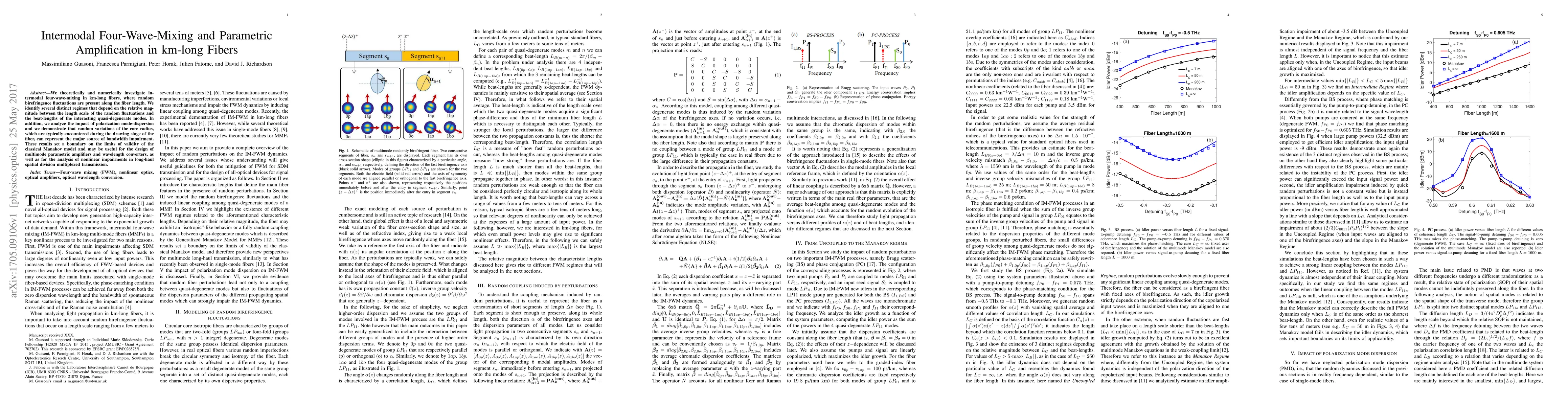This paper investigates intermodal four-wave-mixing in km-long fibers with random birefringence fluctuations, identifying distinct regimes based on the interplay of fluctuation length scales and beat-lengths. It also highlights the impact of polarization mode-dispersion and core radius variations, suggesting these factors as major sources of bandwidth impairment.