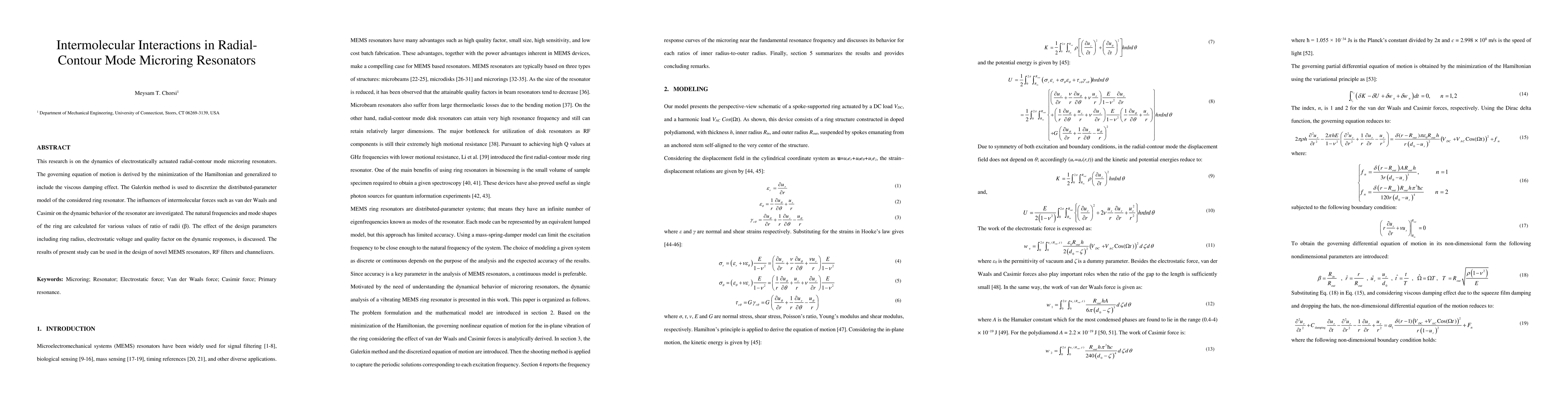 This research is on the dynamics of electrostatically actuated radial-contour mode microring resonators. The governing equation of motion is derived by the minimization of the Hamiltonian and generalized to include the viscous damping effect. The Galerkin method is used to discretize the distributed-parameter model of the considered ring resonator. The influences of intermolecular forces such as van der Waals and Casimir on the dynamic behavior of the resonator are investigated. The natural frequencies and mode shapes of the ring are calculated for various values of ratio of radii (\b{eta}). The effect of the design parameters including ring radius, electrostatic voltage and quality factor on the dynamic responses, is discussed. The results of present study can be used in the design of novel MEMS resonators, RF filters and channelizers.