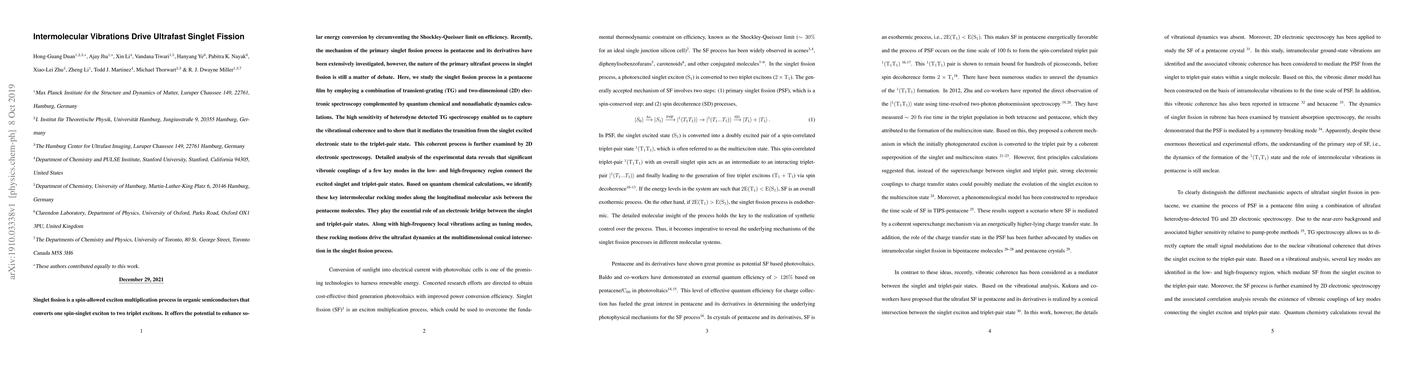 This study reveals that intermolecular vibrations, particularly rocking modes between pentacene molecules, drive the ultrafast singlet fission process by mediating the transition from the singlet excited state to the triplet-pair state, as demonstrated through transient-grating and two-dimensional electronic spectroscopy. Quantum chemical calculations identify these modes as crucial for the electronic coupling necessary for efficient exciton multiplication.