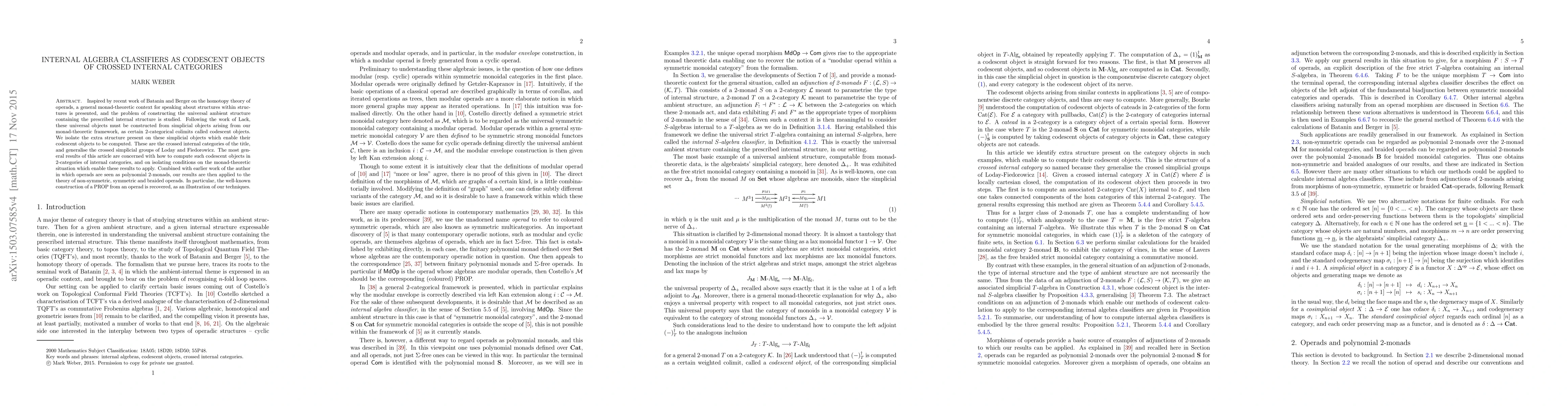 Inspired by recent work of Batanin and Berger on the homotopy theory of operads, a general monad-theoretic context for speaking about structures within structures is presented, and the problem of constructing the universal ambient structure containing the prescribed internal structure is studied. Following the work of Lack, these universal objects must be constructed from simplicial objects arising from our monad-theoretic framework, as certain 2-categorical colimits called codescent objects. We isolate the extra structure present on these simplicial objects which enable their codescent objects to be computed. These are the crossed internal categories of the title, and generalise the crossed simplicial groups of Loday and Fiedorowicz. The most general results of this article are concerned with how to compute such codescent objects in 2-categories of internal categories, and on isolating conditions on the monad-theoretic situation which enable these results to apply. Combined with earlier work of the author in which operads are seen as polynomial 2-monads, our results are then applied to the theory of non-symmetric, symmetric and braided operads. In particular, the well-known construction of a PROP from an operad is recovered, as an illustration of our techniques.