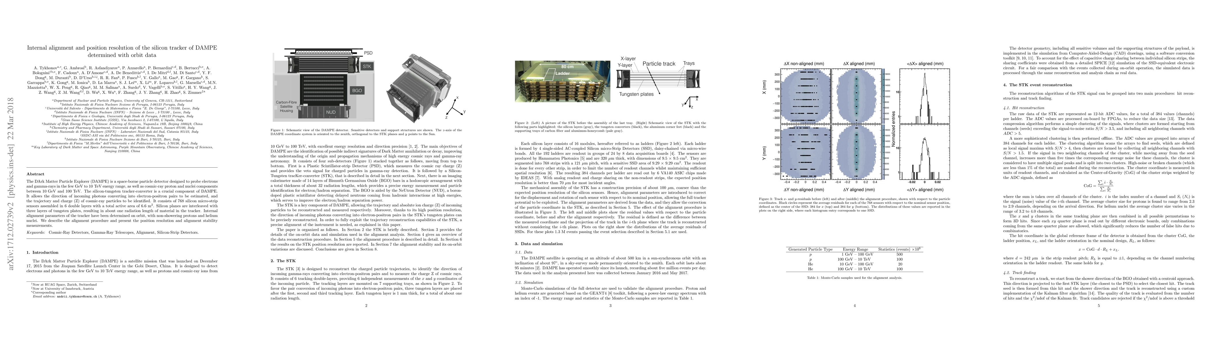 This paper details the internal alignment and position resolution of the silicon tracker in DAMPE, using orbit data and non-showering protons and helium nuclei. The study provides measurements of alignment stability and position resolution for the crucial silicon-tungsten tracker-converter component.