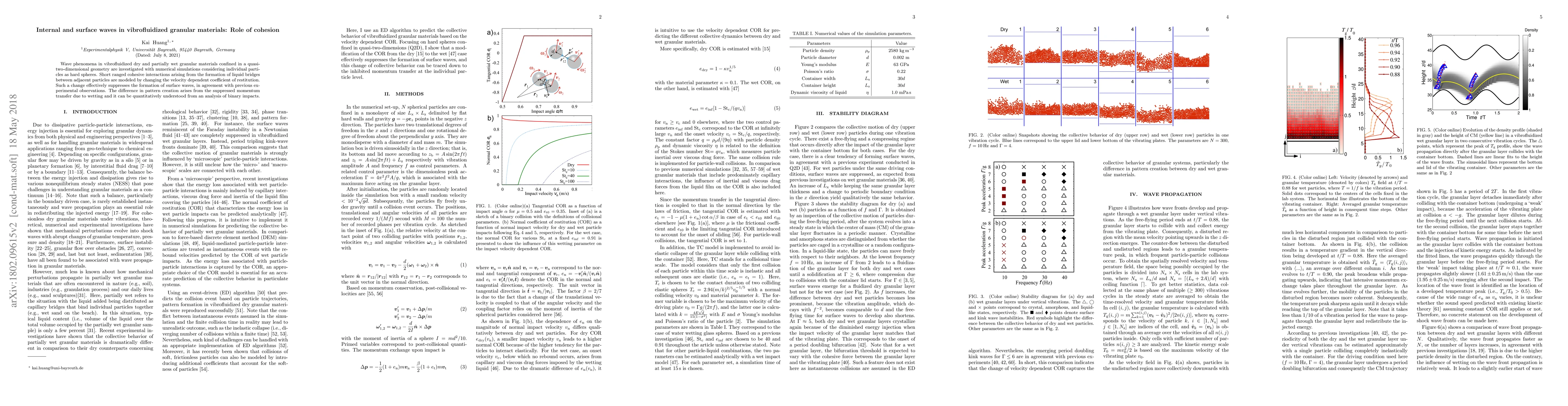 This paper investigates wave phenomena in vibrofluidized granular materials using numerical simulations, focusing on the role of short-range cohesion from liquid bridges. Cohesion suppresses surface waves, which aligns with experimental observations, and the effect is explained through an analysis of binary particle impacts.