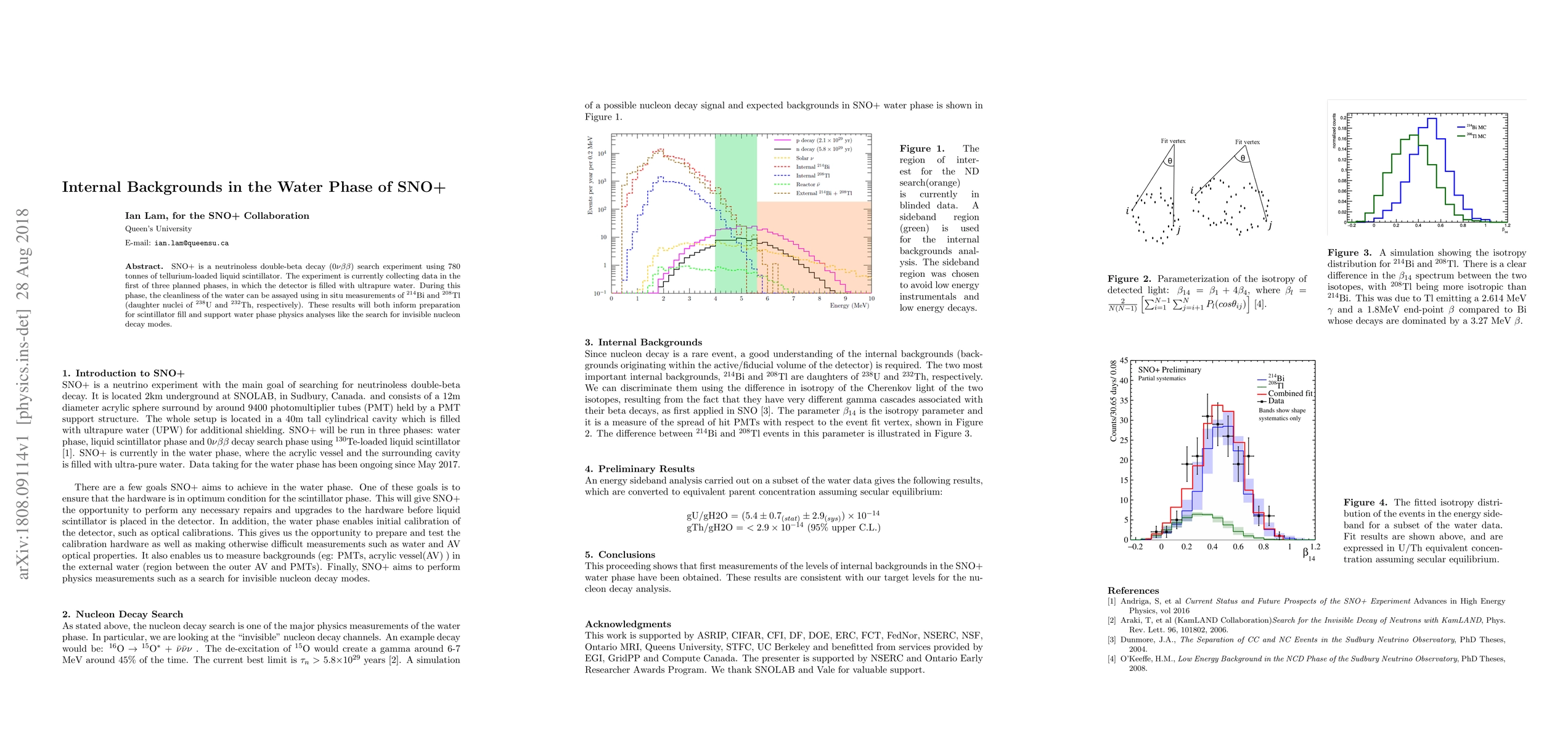 The SNO+ experiment aims to detect neutrinoless double-beta decay using a large volume of tellurium-loaded liquid scintillator. During its initial water phase, in situ measurements of $^{214}$Bi and $^{208}$Tl are used to assess the purity of the water, which informs future scintillator preparations and supports analyses for potential invisible nucleon decay modes.