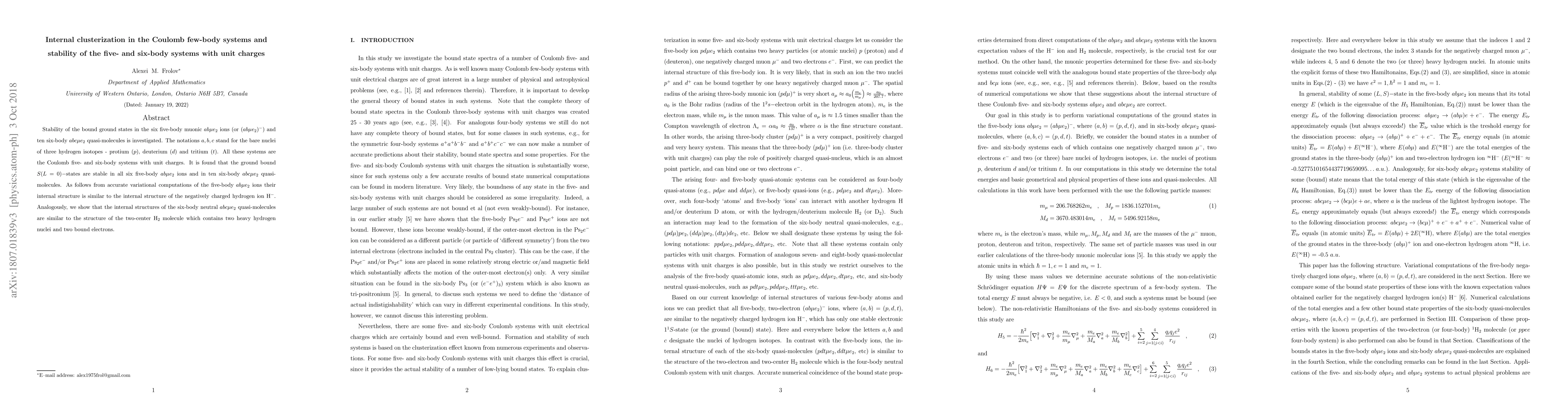 Stability of the bound ground states in the six five-body muonic $a b \mu e_2$ ions (or $(a b \mu e_2)^{-}$) and ten six-body $a b c \mu e_2$ quasi-molecules is investigated. The notations $a, b, c$ stand for the bare nuclei of three hydrogen isotopes - protium ($p$), deuterium ($d$) and tritium ($t$). All these systems are the Coulomb five- and six-body systems with unit charges. It is found that the ground bound $S(L = 0)-$states are stable in all six five-body $a b \mu e_2$ ions and in ten six-body $a b c \mu e_2$ quasi-molecules. As follows from accurate variational computations of the five-body $a b \mu e_2$ ions their internal structure is similar to the internal structure of the negatively charged hydrogen ion H$^{-}$. Analogously, we show that the internal structures of the six-body neutral $a b c \mu e_2$ quasi-molecules are similar to the structure of the two-center H$_{2}$ molecule which contains two heavy hydrogen nuclei and two bound electrons.