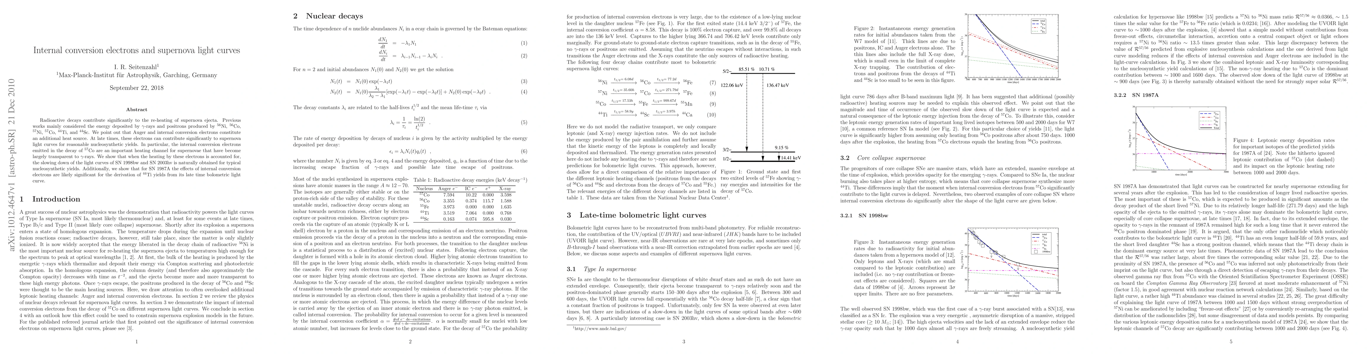 Radioactive decays contribute significantly to the re-heating of supernova ejecta. Previous works mainly considered the energy deposited by gamma-rays and positrons produced by 56Ni, 56Co, 57Ni, 57Co, 44Ti, and 44Sc. We point out that Auger and internal conversion electrons constitute an additional heat source. At late times, these electrons can contribute significantly to supernova light curves for reasonable nucleosynthetic yields. In particular, the internal conversion electrons emitted in the decay of 57Co are an important heating channel for supernovae that have become largely transparent to gamma-rays. We show that when the heating by these electrons is accounted for, the slowing down of the light curves of SN 1998bw and SN 2003hv is naturally obtained for typical nucleosynthetic yields. Additionally, we show that for SN 1987A the effects of internal conversion electrons are likely significant for the derivation of 44Ti yields from its late time bolometric light curve.