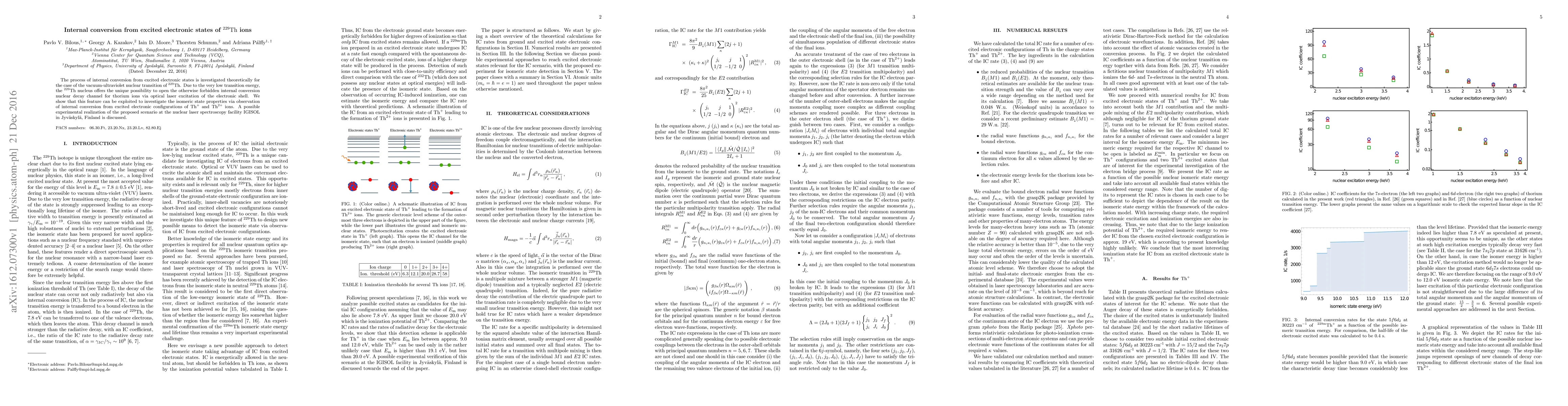 This paper explores the theoretical investigation of internal conversion from excited electronic states in $^{229}$Th ions, highlighting the unique low transition energy that allows optical laser excitation to open a forbidden nuclear decay channel. The study proposes a method to investigate isomeric state properties via internal conversion and discusses its experimental feasibility at the IGISOL facility in Jyväskylä.