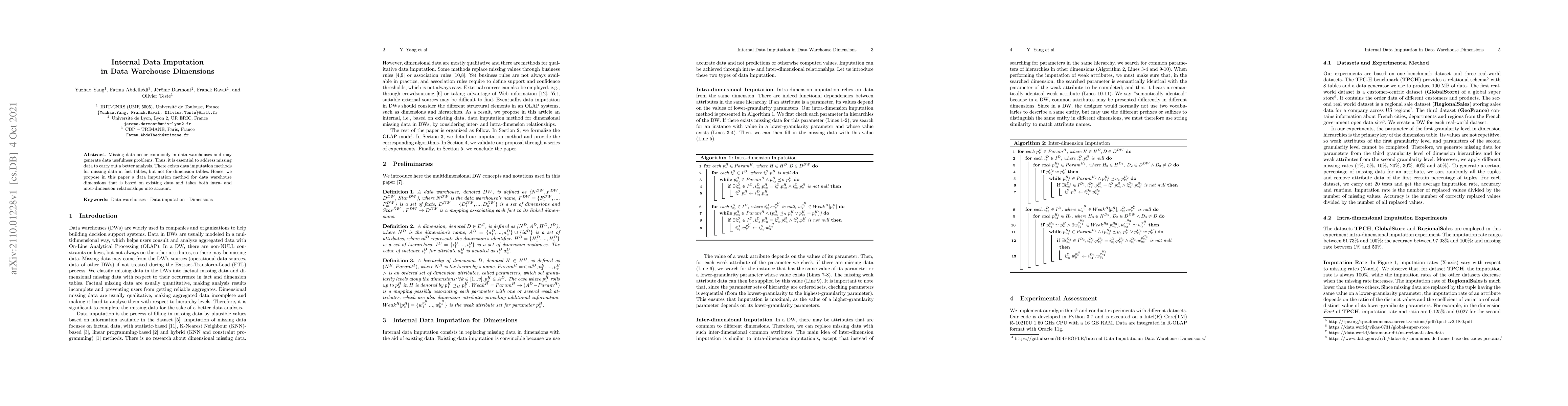 This work stands out by focusing on internal data imputation specifically tailored for multidimensional data warehouse dimensions, considering their hierarchical relationships, and providing algorithms for both intra-dimensional and inter-dimensional imputation.