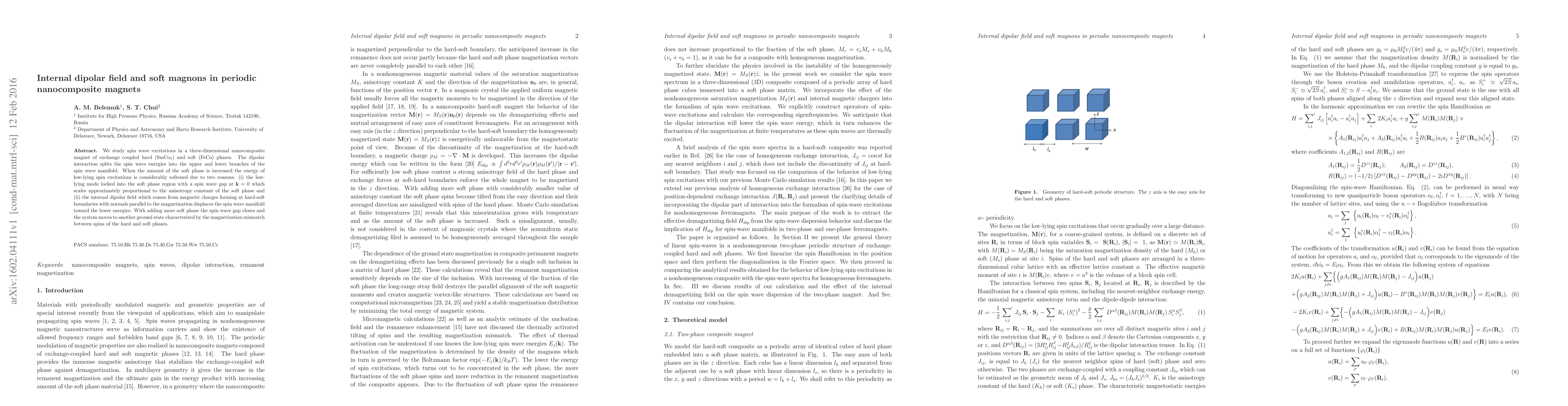 We study spin wave excitations in a three-dimensional nanocomposite magnet of exchange coupled hard (SmCo$_5$) and soft (FeCo) phases. The dipolar interaction splits the spin wave energies into the upper and lower branches of the spin wave manifold. When the amount of the soft phase is increased the energy of low-lying spin excitations is considerably softened due to two reasons: (i) the low- lying mode locked into the soft phase region with a spin wave gap at ${\bf k}= 0$ which scales approximately proportional to the anisotropy constant of the soft phase and (ii) the internal dipolar field which comes from magnetic charges forming at hard-soft boundaries with normals parallel to the magnetization displaces the spin wave manifold toward the lower energies. With adding more soft phase the spin wave gap closes and the system moves to another ground state characterized by the magnetization mismatch between spins of the hard and soft phases.