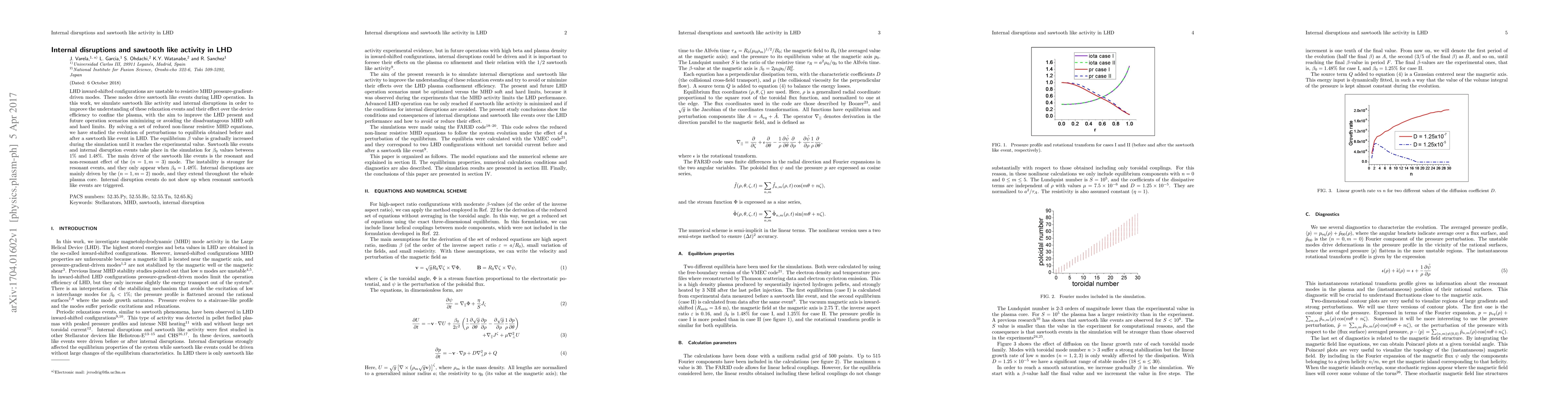 LHD inward-shifted configurations are unstable to resistive MHD pressure-gradient-driven modes. These modes drive sawtooth like events during LHD operation. In this work, we simulate sawtooth like activity and internal disruptions in order to improve the understanding of these relaxation events and their effect over the device efficiency to confine the plasma, with the aim to improve the LHD present and future operation scenarios minimizing or avoiding the disadvantageous MHD soft and hard limits. By solving a set of reduced non-linear resistive MHD equations, we have studied the evolution of perturbations to equilibria obtained before and after a sawtooth like event in LHD. The equilibrium $\beta$ value is gradually increased during the simulation until it reaches the experimental value. Sawtooth like events and internal disruption events take place in the simulation for $\beta_{0}$ values between $1\%$ and $1.48\%$. The main driver of the sawtooth like events is the resonant and non-resonant effect of the $(n=1, m=3)$ mode. The instability is stronger for resonant events, and they only appear when $\beta_{0} = 1.48 \%$. Internal disruptions are mainly driven by the $(n=1, m=2)$ mode, and they extend throughout the whole plasma core. Internal disruption events do not show up when resonant sawtooth like events are triggered.