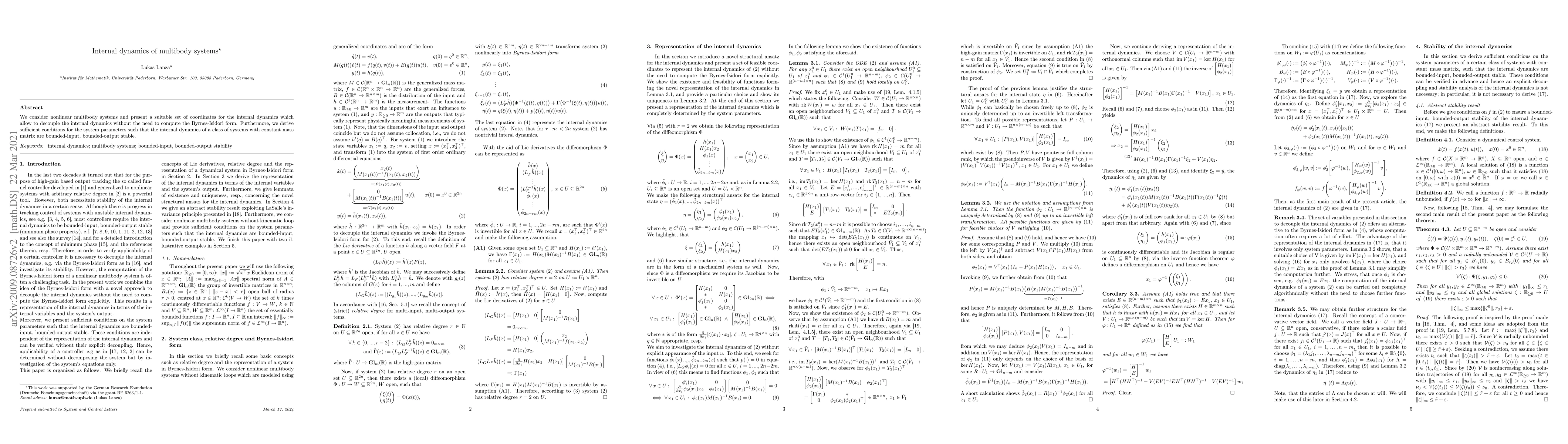 We consider nonlinear multibody systems and present a suitable set of coordinates for the internal dynamics which allow to decouple the internal dynamics without the need to compute the Byrnes-Isidori form. Furthermore, we derive sufficient conditions for the system parameters such that the internal dynamics of a class of systems with constant mass matrix are bounded-input, bounded-output stable.
