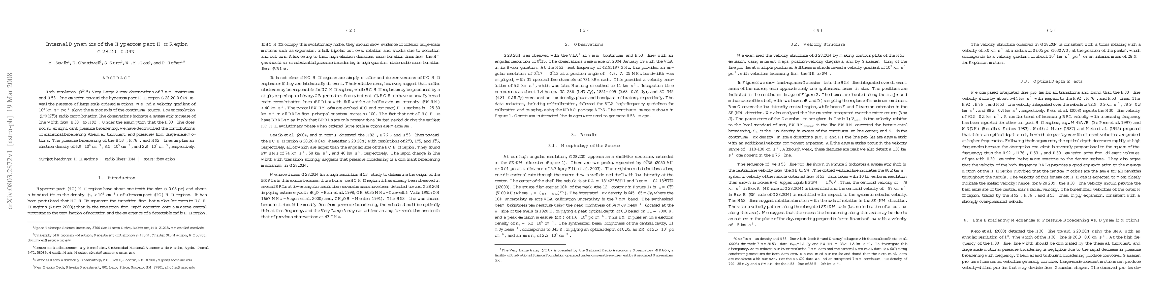 High resolution (0.15") Very Large Array observations of 7 mm continuum and H53a line emission toward the hypercompact H II region G28.20-0.04N reveal the presence of large-scale ordered motions. We find a velocity gradient of 1000 km/s/pc along the minor axis of the continuum source. Lower resolution (1.0"-2.3") radio recombination line observations indicate a systematic increase of line width from H30alpha to H92alpha. Under the assumption that the H30alpha line does not suffer significant pressure broadening, we have deconvolved the contributions of statistical broadening (thermal, turbulent, and pressure) from large-scale motions. The pressure broadening of the H53alpha, H76alpha, and H92alpha lines implies an electron density of 6.9E+06, 8.5E+05, and 2.8E+05 cm^(-3), respectively.