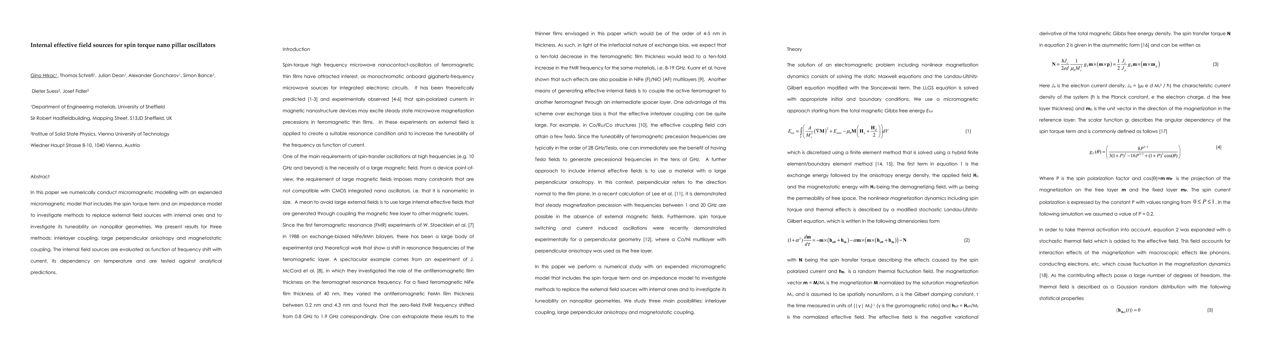 Researchers explored methods to replace external field sources with internal ones in spin torque nano pillar oscillators, finding three viable approaches: interlayer coupling, large perpendicular anisotropy, and magnetostatic coupling.