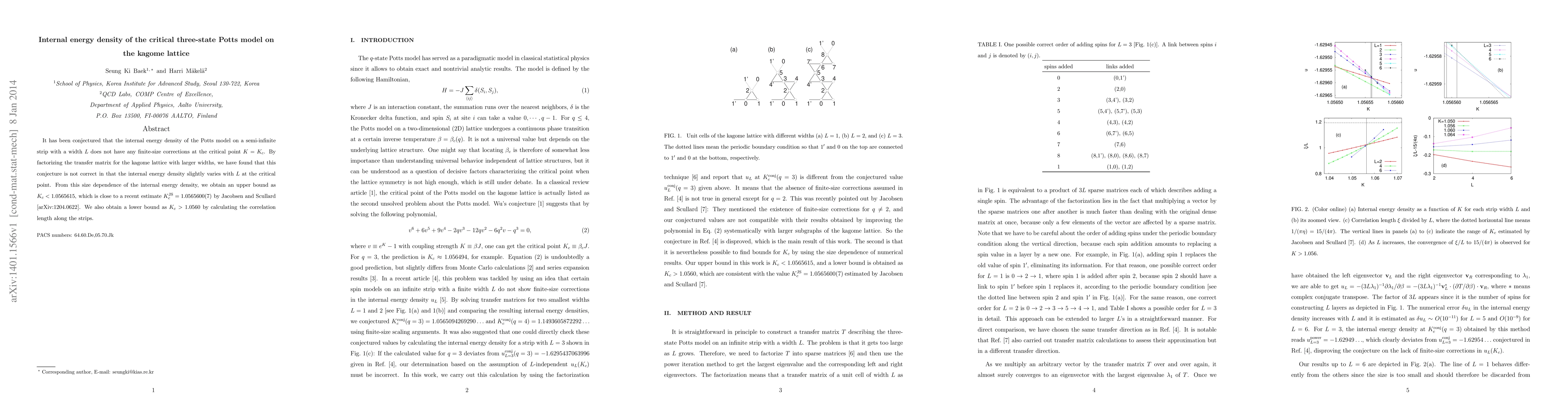 This paper investigates the internal energy density of the critical three-state Potts model on the kagome lattice, finding that it varies with the width $L$ at the critical point, contradicting previous conjectures. The study provides bounds for the critical temperature $K_c$, aligning closely with recent estimates.