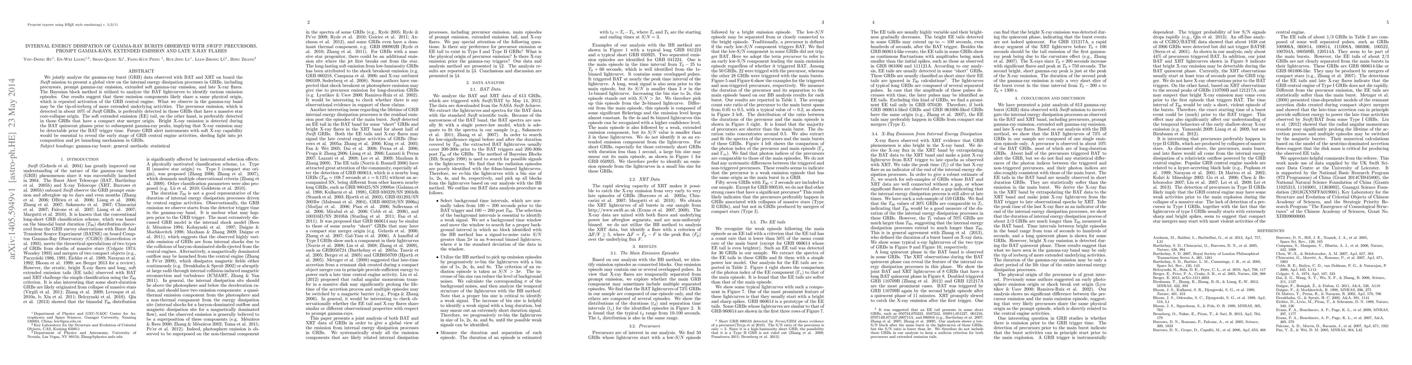 This paper analyzes Swift mission data to explore internal energy dissipation in gamma-ray bursts (GRBs), identifying common physical origins for precursors, prompt gamma-rays, extended emissions, and late X-ray flares. The study suggests that the observed gamma-ray phenomena may represent just the tip of more extensive underlying activities, with different origins for precursor emissions in massive star collapses versus extended soft emissions in compact star mergers.