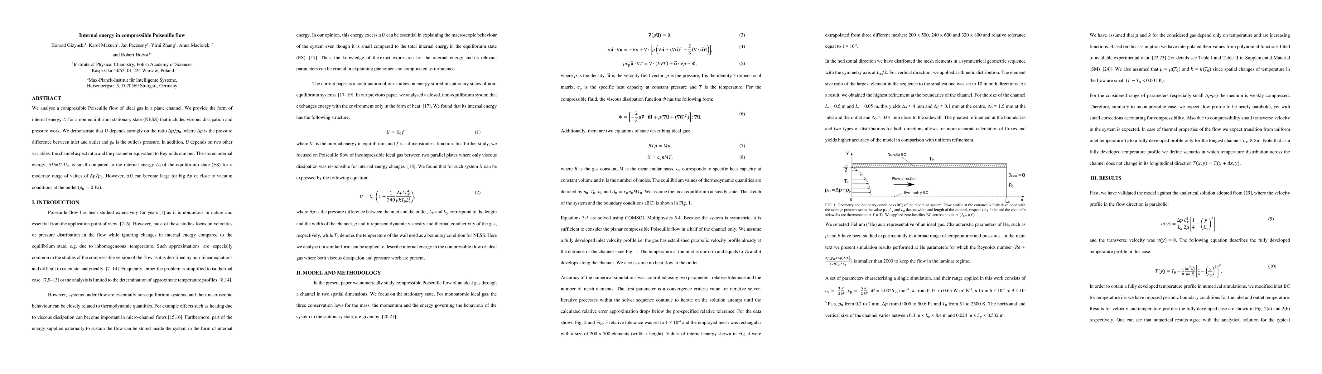 This paper analyzes the internal energy in compressible Poiseuille flow of an ideal gas, showing that it depends on the pressure difference ratio, channel aspect ratio, and a Reynolds number-like parameter. The stored internal energy is relatively small compared to the equilibrium state energy under moderate pressure differences, but can significantly increase under large pressure differences or vacuum conditions.