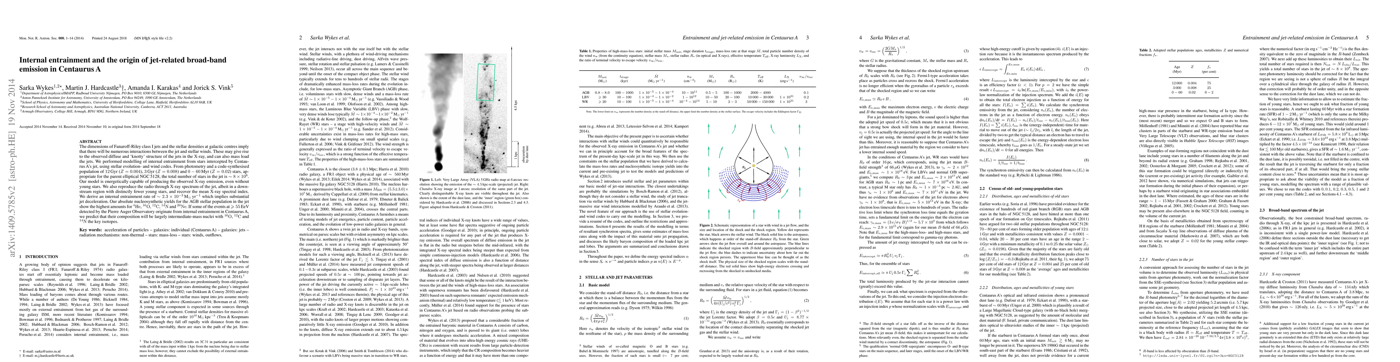 The dimensions of Fanaroff-Riley class I jets and the stellar densities at galactic centres imply that there will be numerous interactions between the jet and stellar winds. These may give rise to the observed diffuse and 'knotty' structure of the jets in the X-ray, and can also mass load the jets. We performed modelling of internal entrainment from stars intercepted by Centaurus A's jet, using stellar evolution- and wind codes. From photometry and a code-synthesised population of 12 Gyr (Z = 0.004), 3 Gyr (Z = 0.008) and 0 - 60 Myr (Z = 0.02) stars, appropriate for the parent elliptical NGC 5128, the total number of stars in the jet is ~ 8 x 10^8. Our model is energetically capable of producing the observed X-ray emission, even without young stars. We also reproduce the radio through X-ray spectrum of the jet, albeit in a downstream region with distinctly fewer young stars, and recover the mean X-ray spectral index. We derive an internal entrainment rate of ~ 2.3 x 10^-3 Msun yr^-1 which implies substantial jet deceleration. Our absolute nucleosynthetic yields for the AGB stellar population in the jet show the highest amounts for 4He, 16O, 12C, 14N and 20Ne. If some of the events at >= 55 EeV detected by the Pierre Auger Observatory originate from internal entrainment in Centaurus A, we predict that their composition will be largely intermediate-mass nuclei with 16O, 12C and 14N the key isotopes.