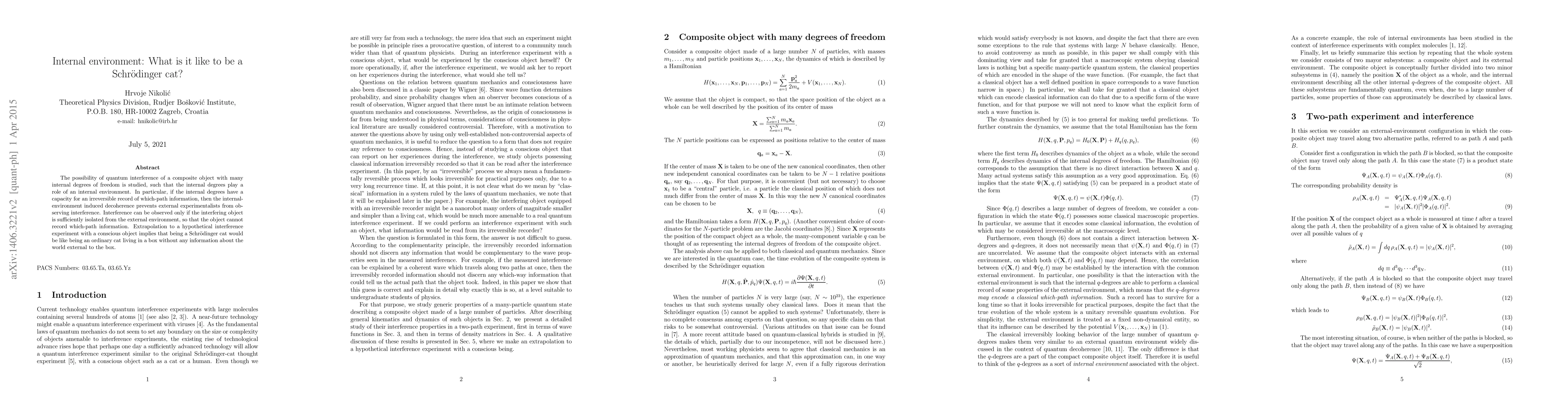 This paper explores quantum interference in composite objects with internal degrees of freedom acting as an internal environment, which can cause decoherence and prevent the observation of interference. It suggests that a "Schrodinger cat" would experience its environment similarly to an ordinary cat in a box, unaware of external influences.