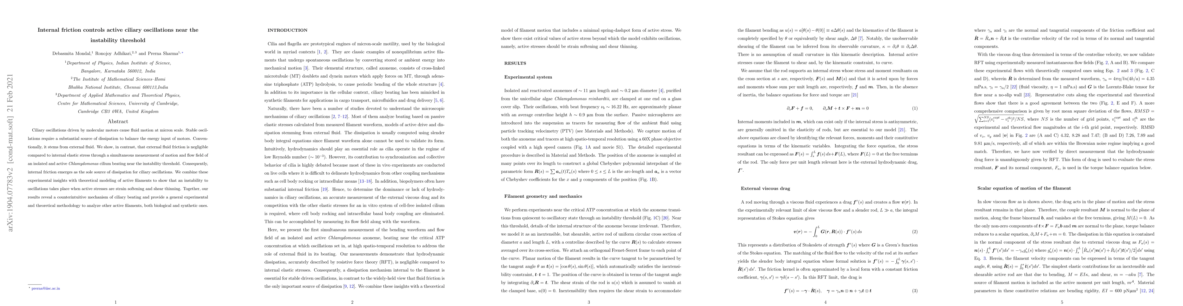 This study demonstrates that internal friction, rather than external fluid friction, is the primary source of dissipation for ciliary oscillations in Chlamydomonas, driven by molecular motors. Theoretical modeling supports that strain softening and shear thinning active stresses lead to instability in ciliary beating.