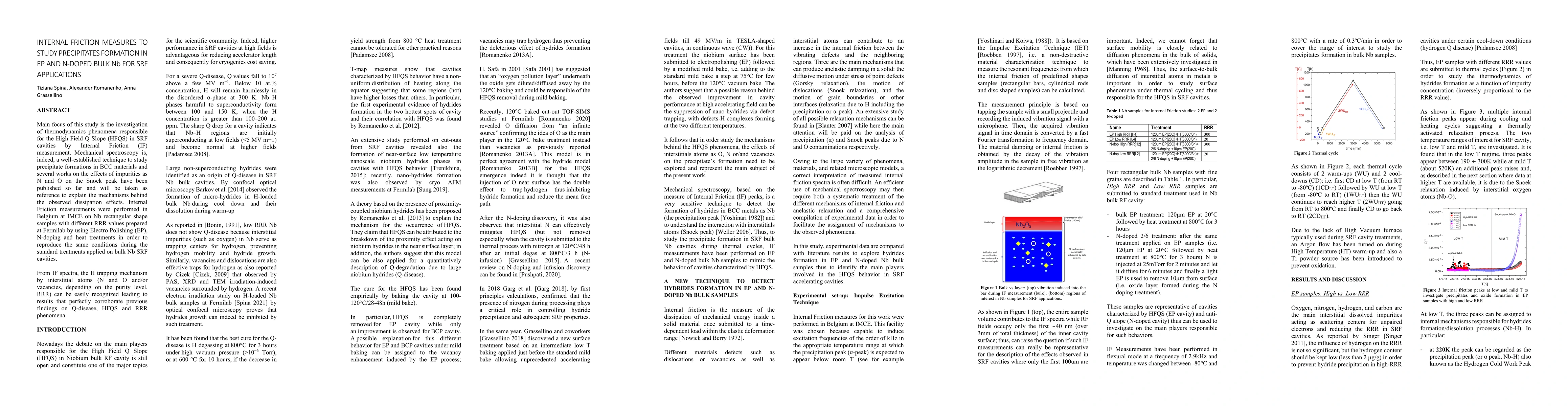 Main focus of this study is the investigation of thermodynamics phenomena responsible for the High Field Q Slope (HFQS) in SRF cavities by Internal Friction (IF) measurement. Mechanical spectroscopy is, indeed, a well-established technique to study precipitate formations in BCC materials and several works on the effects of impurities as N and O on the Snoek peak have been published so far and will be taken as reference to explain the mechanisms behind the observed dissipation effects. Internal Friction measurements were performed in Belgium at IMCE on Nb rectangular shape samples with different RRR values prepared at Fermilab by using Electro Polishing (EP), N-doping and heat treatments in order to reproduce the same conditions during the standard treatments applied on bulk Nb SRF cavities. From IF spectra, the H trapping mechanism by interstitial atoms (N and O and/or vacancies, depending on the purity level, RRR) can be easily recognized leading to results that perfectly corroborate previous findings on Q-disease, HFQS and RRR phenomena.