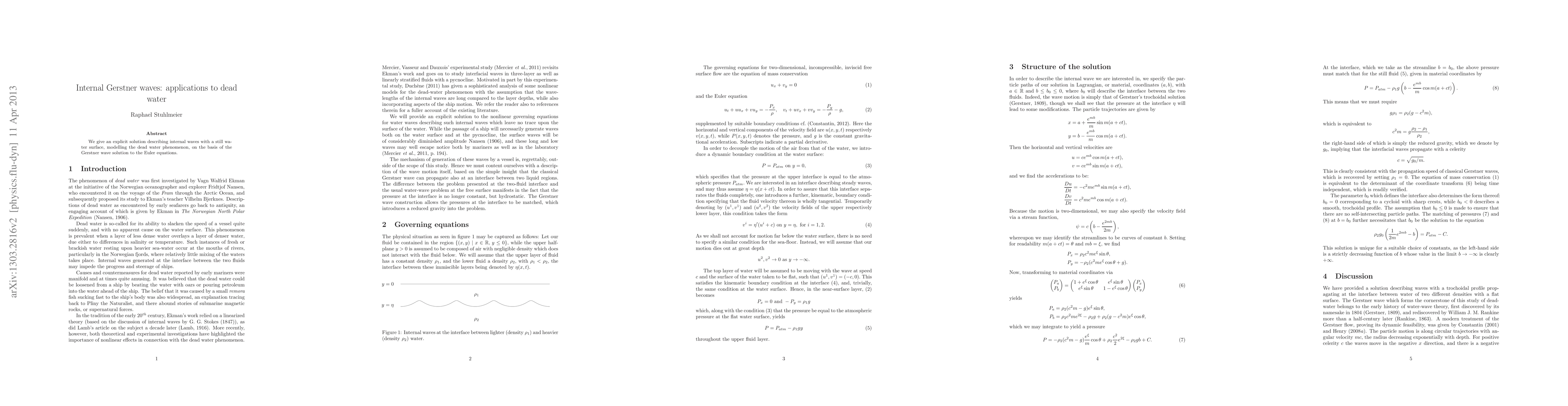 Summary: This paper presents an explicit solution for internal Gerstner waves that model the "dead water" phenomenon, where the surface appears still despite the presence of underlying waves. The solution is derived from the Gerstner wave solution to the Euler equations.