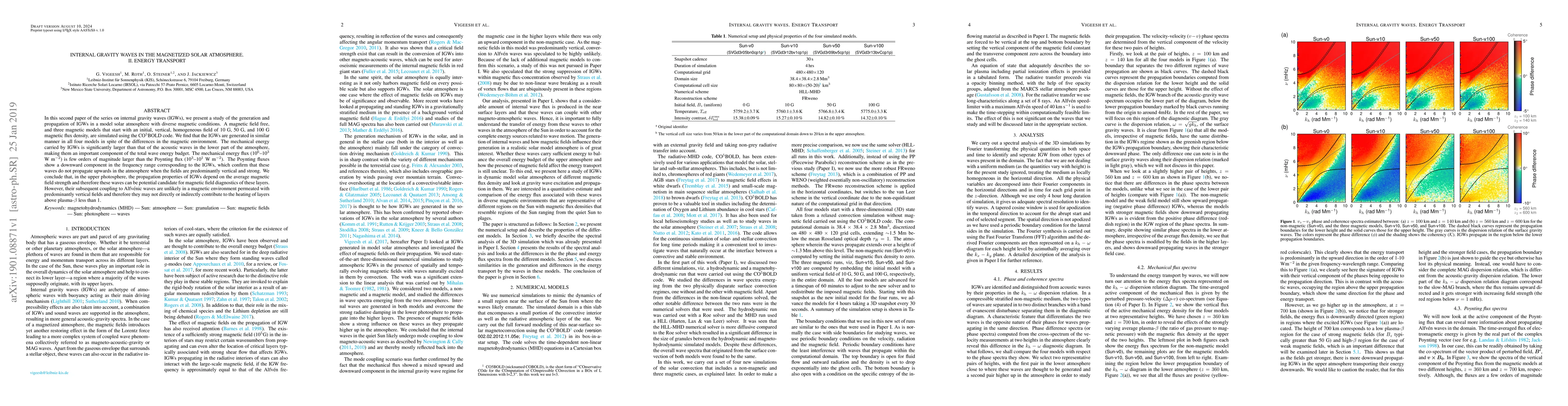 This paper investigates the generation and propagation of internal gravity waves (IGWs) in magnetized solar atmospheres, finding that IGWs carry significantly more mechanical energy than acoustic waves. The study concludes that IGWs' propagation and energy transport are influenced by magnetic field strength, making them potential diagnostics for magnetic fields in the upper photosphere, though they are unlikely to contribute to heating in regions with strong vertical magnetic fields.