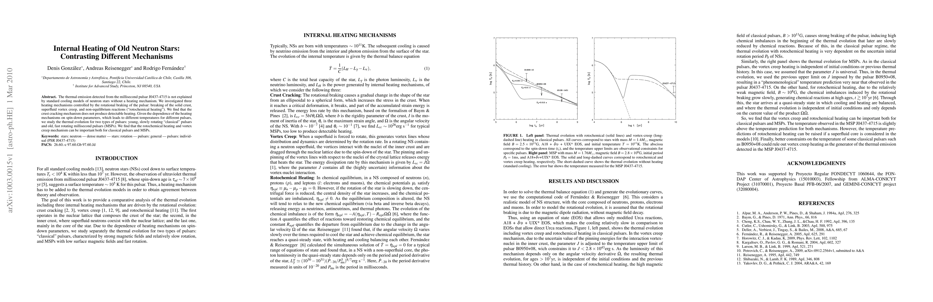 The thermal emission detected from the millisecond pulsar J0437-4715 is not explained by standard cooling models of neutron stars without a heating mechanism. We investigated three heating mechanisms controlled by the rotational braking of the pulsar: breaking of the solid crust, superfluid vortex creep, and non-equilibrium reactions ('rotochemical heating'). We find that the crust cracking mechanism does not produce detectable heating. Given the dependence of the heating mechanisms on spin-down parameters, which leads to different temperatures for different pulsars, we study the thermal evolution for two types of pulsars: young, slowly rotating 'classical' pulsars and old, fast rotating millisecond pulsars (MSPs). We find that the rotochemical heating and vortex creep mechanism can be important both for classical pulsars and MSPs.