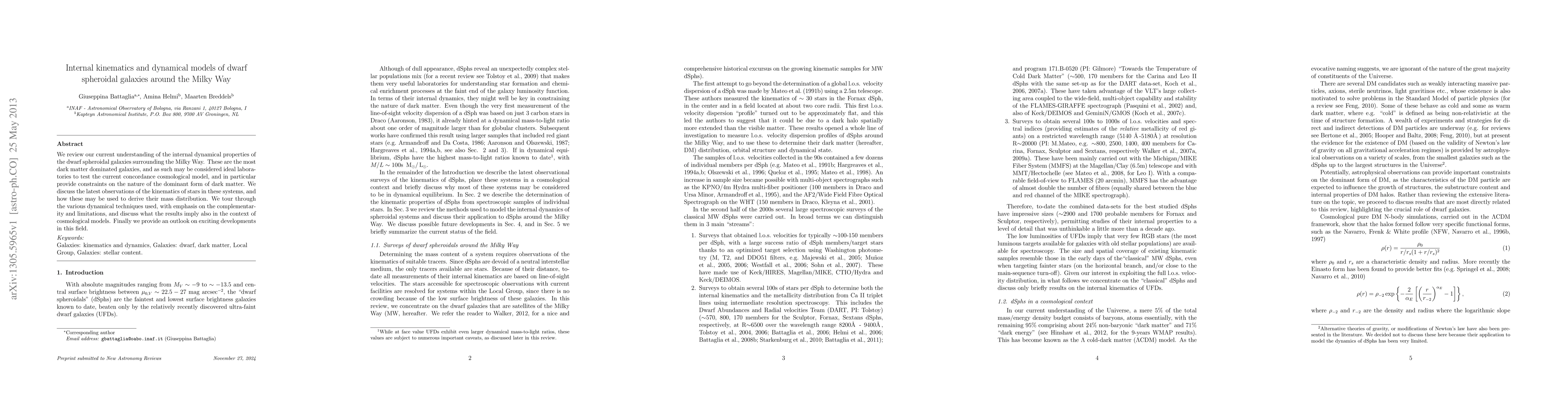 This paper reviews the internal dynamics and mass distribution of dwarf spheroidal galaxies around the Milky Way, emphasizing their role in testing dark matter models. It discusses observational kinematics, dynamical modeling techniques, and their implications for cosmological models, concluding with future research prospects.