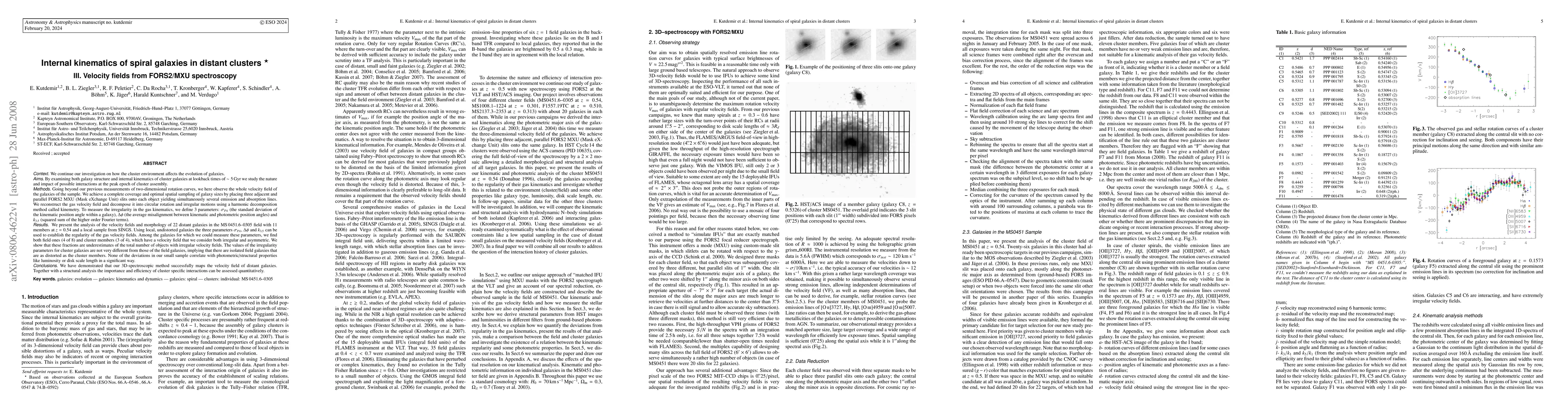 (Abridged) We study the impact of cluster environment on the evolution of spiral galaxies by examining their structure and kinematics. Rather than two-dimensional rotation curves, we observe complete velocity fields by placing three adjacent and parallel FORS2 MXU slits on each object, yielding several emission and absorption lines. The gas velocity fields are reconstructed and decomposed into circular rotation and irregular motions using kinemetry. To quantify irregularities in the gas kinematics, we define three parameters: sigma_{PA} (standard deviation of the kinematic position angle), Delta phi (the average misalignment between kinematic and photometric position angles) and k_{3,5} (squared sum of the higher order Fourier terms). Using local, undistorted galaxies from SINGS, these can be used to establish the regularity of the gas velocity fields. Here we present the analysis of 22 distant galaxies in the MS0451.6-0305 field with 11 members at z=0.54. In this sample we find both field (4 out of 8) and cluster (3 out of 4) galaxies with velocity fields that are both irregular and asymmetric. We show that these fractions are underestimates of the actual number of galaxies with irregular velocity fields. The values of the (ir)regularity parameters for cluster galaxies are not very different from those of the field galaxies, implying that there are isolated field galaxies that are as distorted as the cluster members. None of the deviations in our small sample correlate with photometric/structural properties like luminosity or disk scale length in a significant way. Our 3D-spectroscopic method successfully maps the velocity field of distant galaxies, enabling the importance and efficiency of cluster specific interactions to be assessed quantitatively.