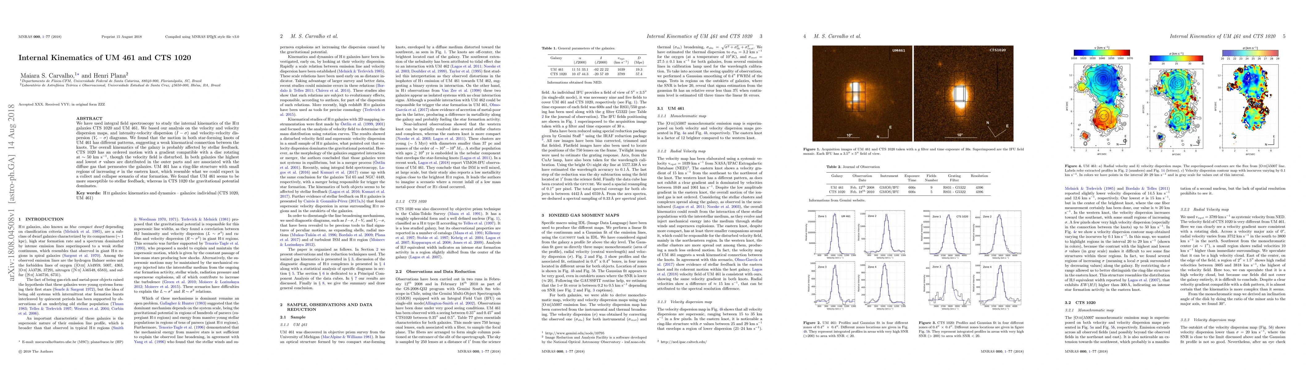 We have used integral field spectroscopy to study the internal kinematics of the H\,{\sc ii} galaxies CTS 1020 and UM 461. We based our analysis on the velocity and velocity dispersion maps, and intensity-velocity dispersion ($I-\sigma$) and velocity-velocity dispersion ($V_r-\sigma$) diagrams. We found that the motion in both star-forming knots of UM 461 has different patterns, suggesting a weak kinematical connection between the knots. The overall kinematics of the galaxy is probably affected by stellar feedback. CTS 1020 has an ordered motion with a gradient compatible with a disc rotating at $\sim50$ km s$^{-1}$, though the velocity field is disturbed. In both galaxies the highest and lowest $\sigma$ values are distributed in the outer parts and are associated with the diffuse gas that permeates the galaxies. UM 461 has a ring-like structure with small regions of increasing $\sigma$ in the eastern knot, which resemble what we could expect in a collect and collapse scenario of star formation. We found that UM 461 seems to be more susceptible to stellar feedback, whereas in CTS 1020 the gravitational potential dominates.