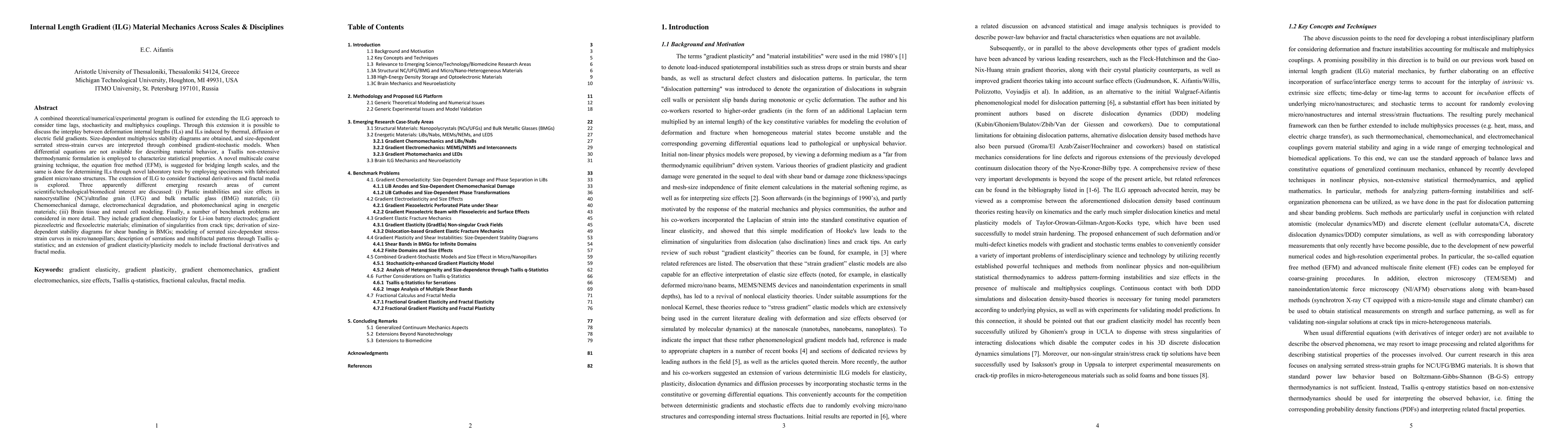 A combined theoretical/numerical/experimental program is outlined for extending the ILG approach to consider time lags, stochasticity and multiphysics couplings. Through this extension it is possible to discuss the interplay between deformation internal lengths (ILs) and ILs induced by thermal, diffusion or electric field gradients. Size-dependent multiphysics stability diagrams are obtained, and size-dependent serrated stress-strain curves are interpreted through combined gradient-stochastic models. When differential equations are not available for describing material behavior, a Tsallis non-extensive thermodynamic formulation is employed to characterize statistical properties. A novel multiscale coarse graining technique, the equation free method (EFM), is suggested for bridging length scales, and the same is done for determining ILs through novel laboratory tests by employing specimens with fabricated gradient micro/nano structures. Three emerging research areas are discussed: (i) Plastic instabilities and size effects in nanocrystalline (NC)/ultrafine grain (UFG) and bulk metallic glass (BMG) materials; (ii) Chemomechanical damage, electromechanical degradation, and photomechanical aging in energetic materials; (iii) Brain tissue and neural cell modeling. Finally, a number of benchmark problems are considered in more detail. They include gradient chemoelasticity for Li-ion battery electrodes; gradient piezoelectric and flexoelectric materials; elimination of singularities from crack tips; derivation of size-dependent stability diagrams for shear banding in BMGs; modeling of serrated size-dependent stress-strain curves in micro/nanopillars; description of serrations and multifractal patterns through Tsallis q-statistics; and an extension of gradient elasticity/plasticity models to include fractional derivatives and fractal media.