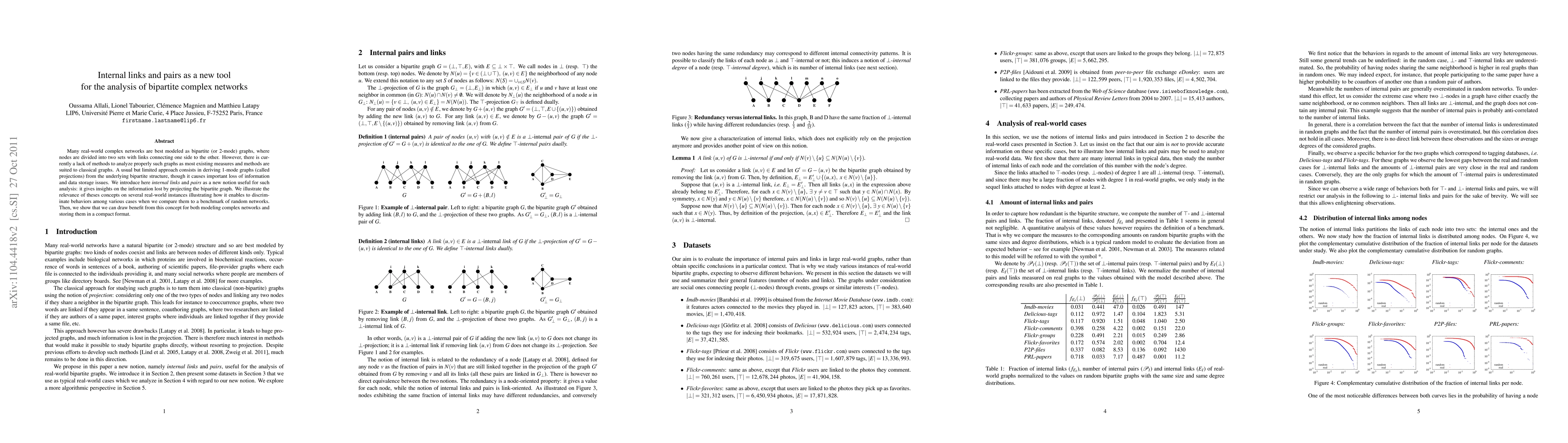 Many real-world complex networks are best modeled as bipartite (or 2-mode) graphs, where nodes are divided into two sets with links connecting one side to the other. However, there is currently a lack of methods to analyze properly such graphs as most existing measures and methods are suited to classical graphs. A usual but limited approach consists in deriving 1-mode graphs (called projections) from the underlying bipartite structure, though it causes important loss of information and data storage issues. We introduce here internal links and pairs as a new notion useful for such analysis: it gives insights on the information lost by projecting the bipartite graph. We illustrate the relevance of theses concepts on several real-world instances illustrating how it enables to discriminate behaviors among various cases when we compare them to a benchmark of random networks. Then, we show that we can draw benefit from this concept for both modeling complex networks and storing them in a compact format.