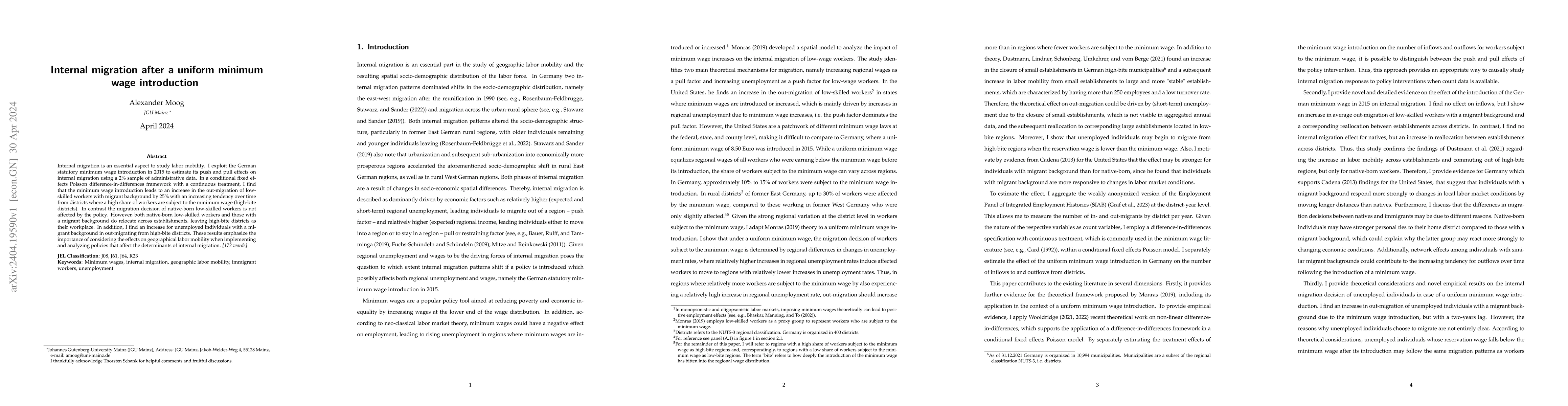 This paper investigates the impact of Germany's 2015 minimum wage introduction on internal migration, finding a 25% increase in out-migration of low-skilled workers with a migrant background from districts heavily affected by the wage policy. Native-born low-skilled workers remain unaffected, though both groups relocate workplaces.